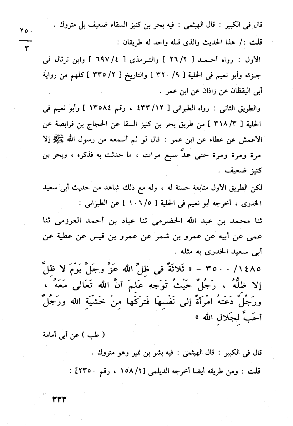 1485/ 3500 - "ثَلاثَةٌ في ظِلِّ اللَّه عَزَّ وجَلَّ يَوْمَ لا ظِلَّ إلا ظِلُّهُ، رَجُلٌ حَيثُ تَوَجه عَلِمَ أن اللَّه تَعَالى مَعَهُ، ورَجُلٌ دَعَتهُ امْرَأةٌ إلى نَفْسِهَا فَترَكَها مِنْ خَشيَةِ اللَّه ورَجُلٌ أحَبَّ لجلالِ اللَّه"