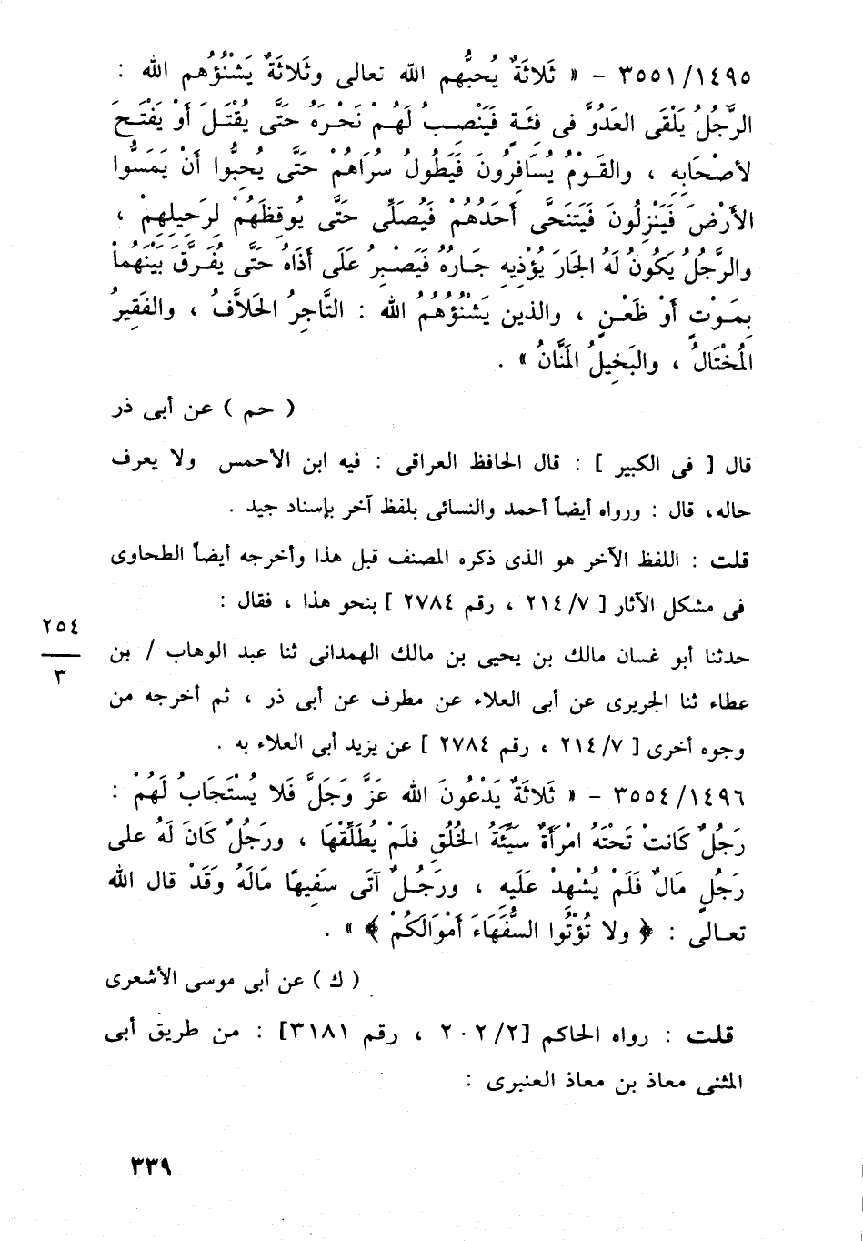 1495/ 3551 - "ثَلاثَةٌ يُحبُّهم اللَّه تعالى وثَلاثَةٌ يَشْنُؤُهم اللَّه: الرَّجُلُ يَلْقَى العَدُوَّ فِي فِئَةٍ فَيَنْصِبُ لَهُمْ نَحْرَهُ حَتَّى يُقْتَلَ أَوْ يَفْتَحَ لأَصْحَابِهِ، والقَوْمُ يُسَافِرُونَ فَيَطُولُ سُرَاهُمْ حَتَّى يُحِبُّوا أَنْ يَمَسُّوا الأَرْضَ فَيَنْزِلُونَ فَيَتنَحَّى أَحَدُهُمْ فَيُصَلِّى حَتَّى يُوقِظَهُمْ لِرَحِيلِهِمْ، والرَّجُلُ يَكُونُ لَهُ الجَارَ يُؤْذِيهِ جَارُهُ فَيَصْبِرُ عَلَى أَذَاهُ حَتَّى يُفَرَّق بَيْنَهُما بِمَوْتٍ أَوْ ظَعْنٍ، والذين يَشْنُؤُهُمُ اللَّه: التَّاجِرُ الحَلَّافُ، والفَقِيرُ المُخْتَالُ، والبَخِيلُ المَنَّانُ".