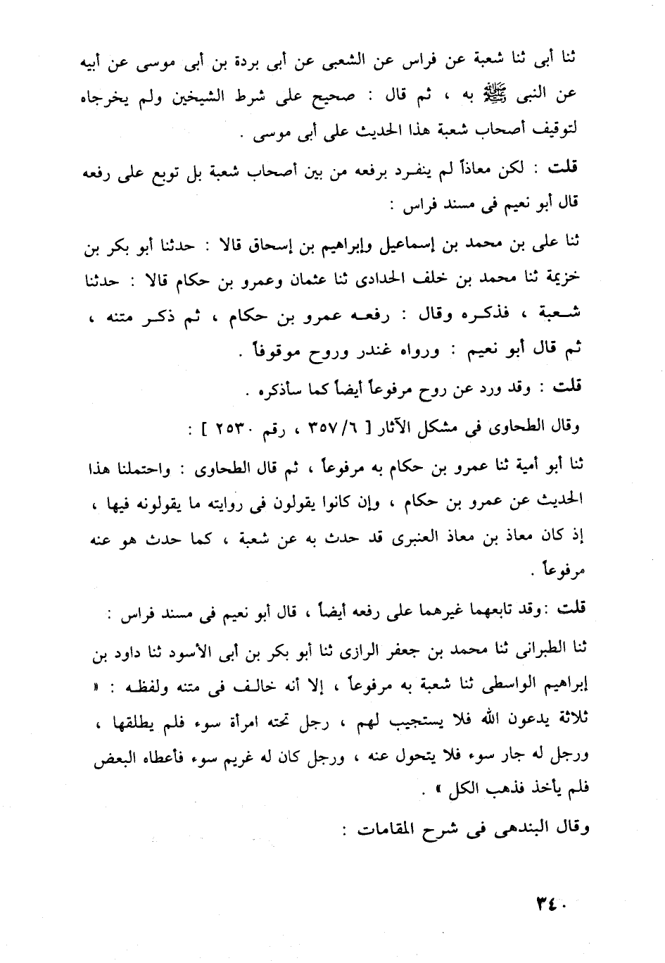 ثنا أبو أمية ثنا عمرو بن حكام به مرفوعًا، ثم قال الطحاوى: واحتملنا هذا الحديث عن عمرو بن حكام، وإن كانوا يقولون في روايته ما يقولونه فيها، إذ كان معاذ بن معاذ العنبرى قد حدث به عن شعبة، كما حدث هو عنه مرفوعًا.