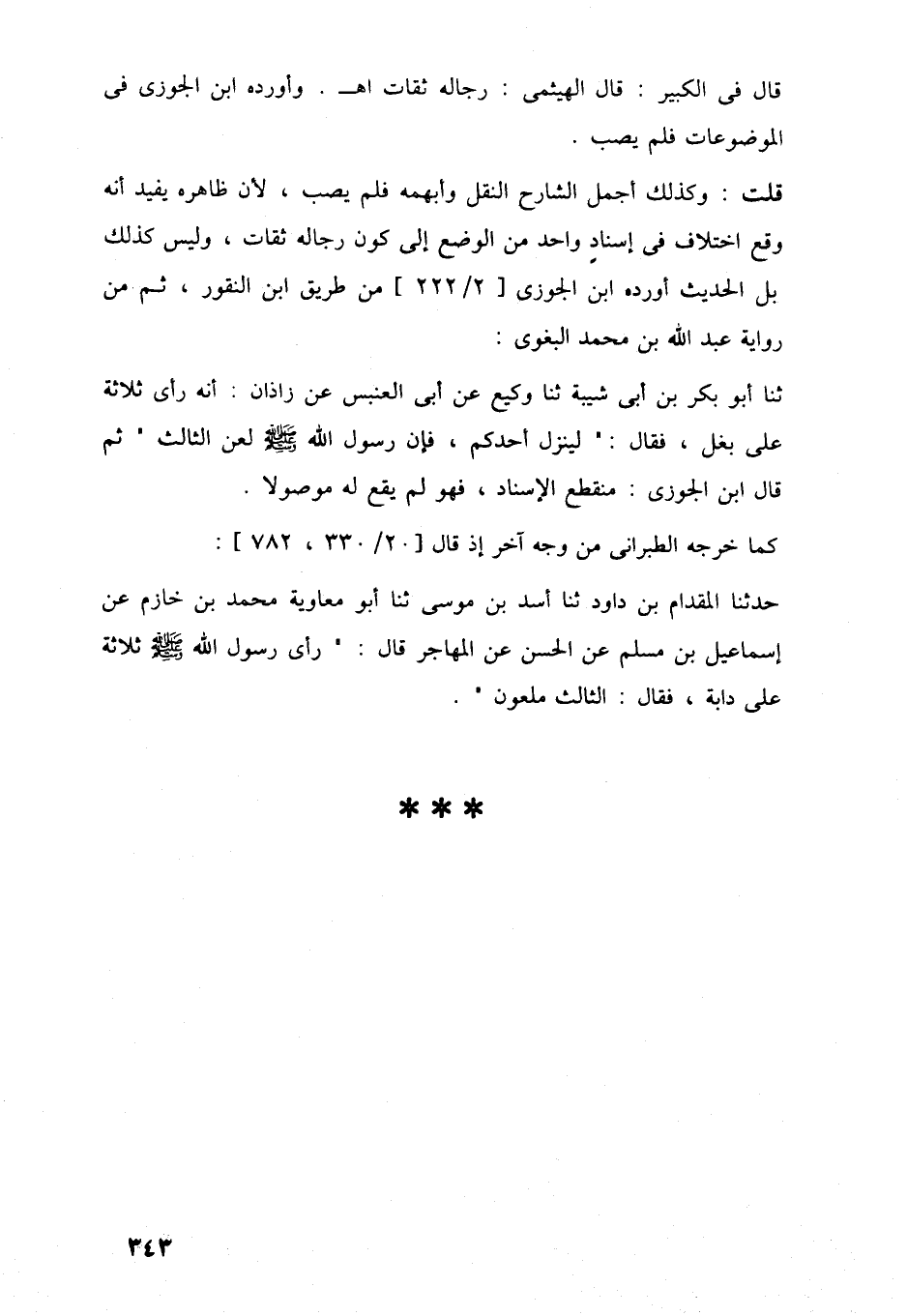 ثنا أبو بكر بن أبي شيبة ثنا وكيع عن أبي العنبس عن زاذان: أنه رأى ثلاثة على بغل، فقال: "لينزل أحدكم، فكان رسول اللَّه -صلى اللَّه عليه وسلم- لعن الثالث" ثم قال ابن الجوزى: منقطع الإسناد، فهو لم يقع له موصولًا.