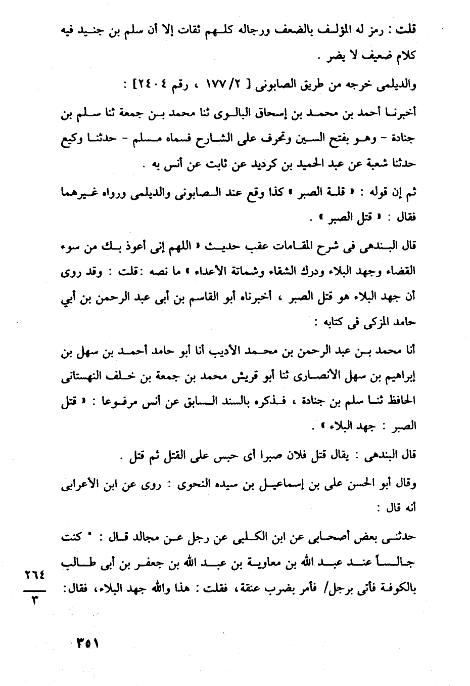 أنا محمد بن عبد الرحمن بن محمد الأديب أنا أبو حامد أحمد بن سهل بن إبراهيم بن سهل الأنصارى ثنا أبو قريش محمد بن جمعة بن خلف النهستانى الحافظ ثنا سلم بن جنادة، فذكره بالسند السابق عن أنس مرفوعًا: "قتل الصبر: جهد البلاء".