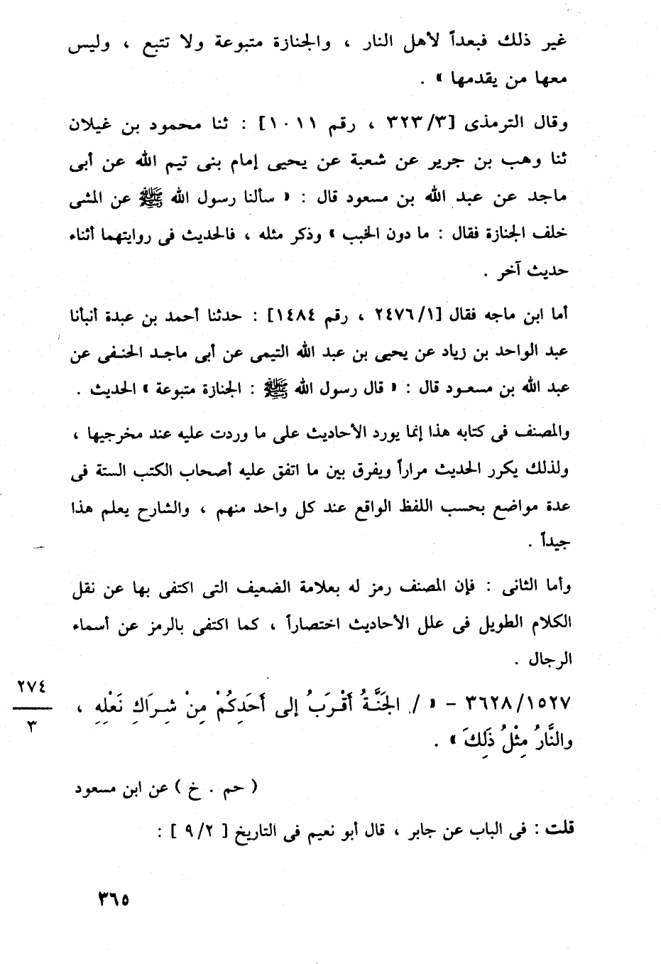 أما ابن ماجه فقال [1/ 2476، رقم 1484]: حدثنا أحمد بن عبدة أنبأنا عبد الواحد بن زياد عن يحيى بن عبد اللَّه التيمى عن أبي ماجد الحنفى عن عبد اللَّه بن مسعود قال: "قال رسول اللَّه -صلى اللَّه عليه وسلم-: الجنازة متبوعة" الحديث.
