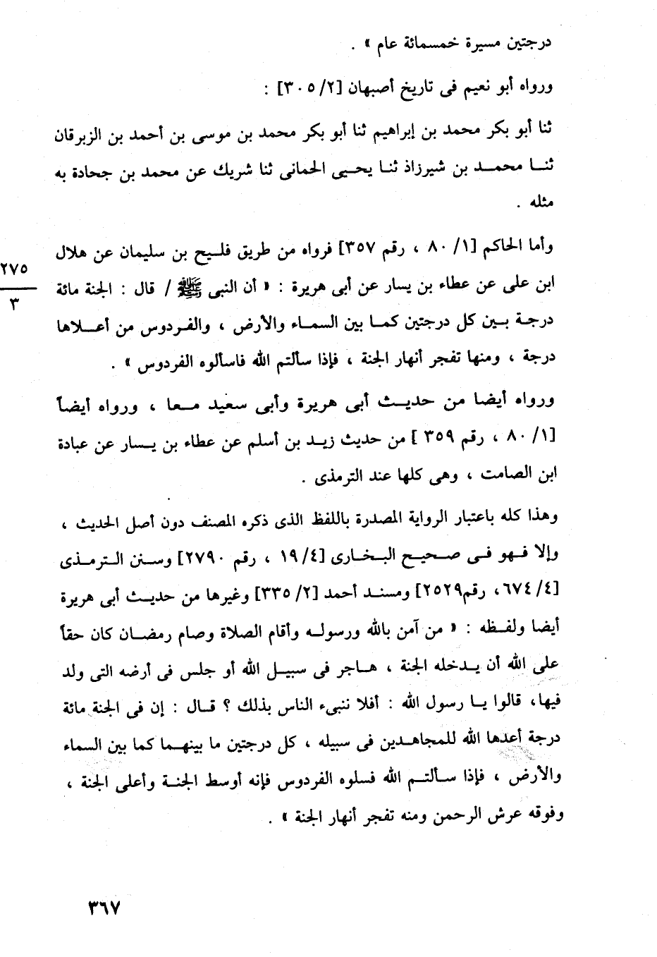 وأما الحاكم [1/ 80، رقم 357] فرواه من طريق فليح بن سليمان عن هلال ابن على عن عطاء بن يسار عن أبي هريرة: "أن النبي -صلى اللَّه عليه وسلم- قال: الجنة مائة درجة بين كل درجتين كما بين السماء والأرض، والفردوس من أعلاها درجة، ومنها تفجر أنهار الجنة، فإذا سألتم اللَّه فاسألوه الفردوس".