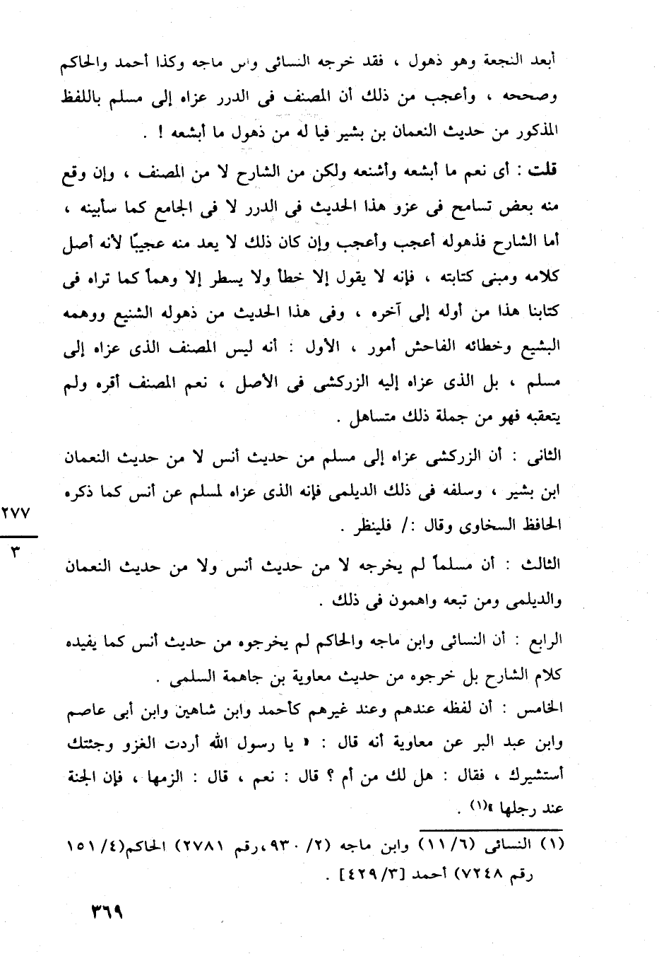 أبعد النجعة وهو ذهول، فقد خرجه النسائى وابن ماجه وكذا أحمد والحاكم وصححه، وأعجب من ذلك أن المصنف في الدرر عزاه إلى مسلم باللفظ المذكور من حديث النعمان بن بشير فيا له من ذهول ما أبشعه!.