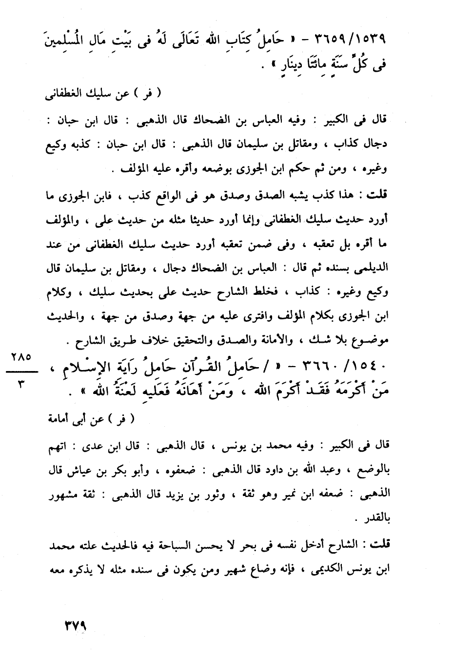 1539/ 3659 - "حَامِلُ كِتَابِ اللَّه تَعَالَى لَهُ في بَيْتِ مَالِ المُسْلِمينَ فِي كُلِّ سَنَةٍ مِائَتَا دِينَارٍ".
