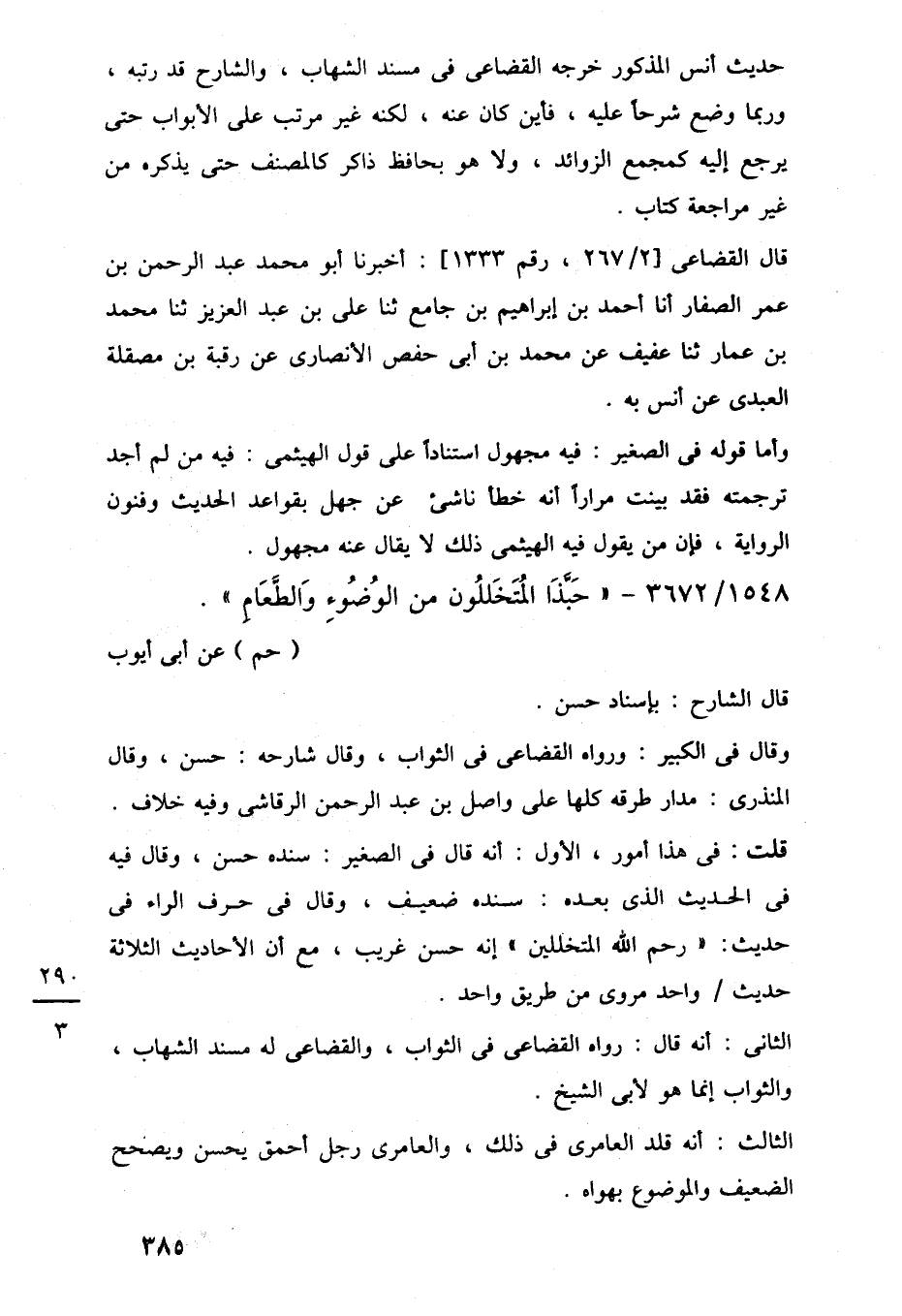 وقال في الكبير: ورواه القضاعى في الثواب، وقال شارحه: حسن، وقال المنذرى: مدار طرقه كلها على واصل بن عبد الرحمن الرقاشى وفيه خلاف.