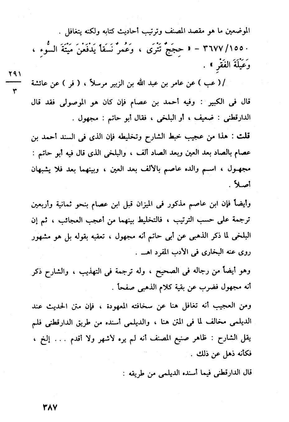 وأيضًا فإن ابن عاصم مذكور في الميزان قبل ابن عصام بنحو ثمانية وأربعين ترجمة على حسب الترتيب، فالتخليط بينهما من أعجب العجائب، ثم إن البلخى لما ذكر الذهبى عن أبي حاتم أنه مجهول، تعقبه بقوله بل هو مشهور روى عنه البخارى في الأدب المفرد اهـ.