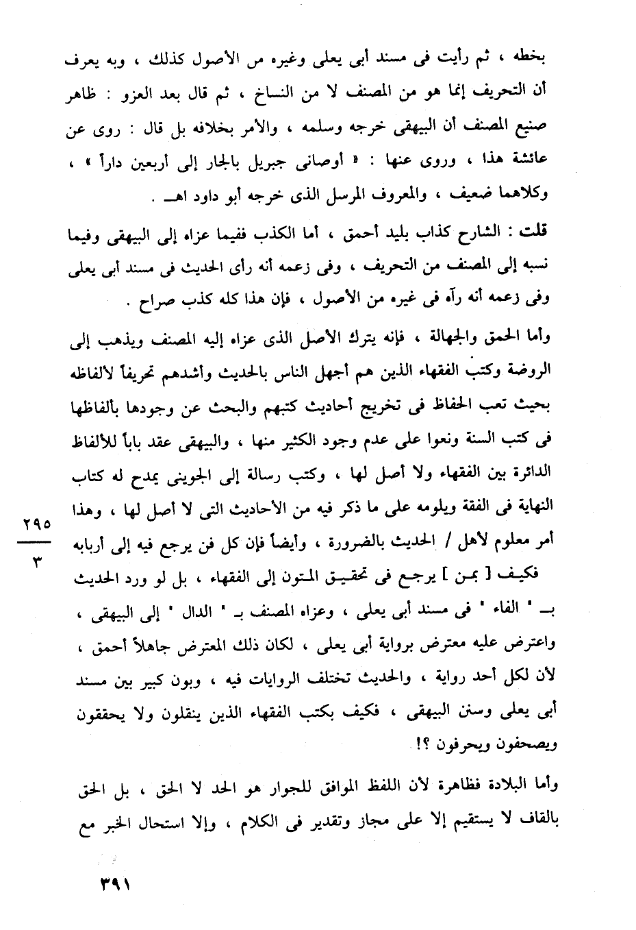 وأما الحمق والجهالة، فإنه يترك الأصل الذي عزاه إليه المصنف ويذهب إلى الروضة وكتب الفقهاء الذين هم أجهل الناس بالحديث وأشدهم تحريفًا لألفاظه بحيث تعب الحفاظ في تخريج أحاديث كتبهم والبحث عن وجودها بألفاظها في كتب السنة ونعوا على عدم وجود الكثير منها، والبيهقى عقد بابًا للألفاظ الدائرة بين الفقهاء ولا أصل لها، وكتب رسالة إلى الجوينى يمدح له كتاب النهاية في الفقة ويلومه على ما ذكر فيه من الأحاديث التي لا أصل لها، وهذا أمر معلوم لأهل الحديث بالضرورة، وأيضًا فإن كل فن يرجع فيه إلى أربابه فكيف [بمن] يرجع في تحقيق المتون إلى الفقهاء، بل لو ورد الحديث بـ "الفاء" في مسند أبي يعلى، وعزاه المصنف بـ "الدال" إلى البيهقى، واعترض عليه معترض برواية أبي يعلى، لكان ذلك المعترض جاهلًا أحمق، لأن لكل أحد رواية، والحديث تختلف الروايات فيه، وبون كبير بين مسند أبي يعلى وسنن البيهقى، فكيف بكتب الفقهاء الذين ينقلون ولا يحققون ويصحفون ويحرفون؟!