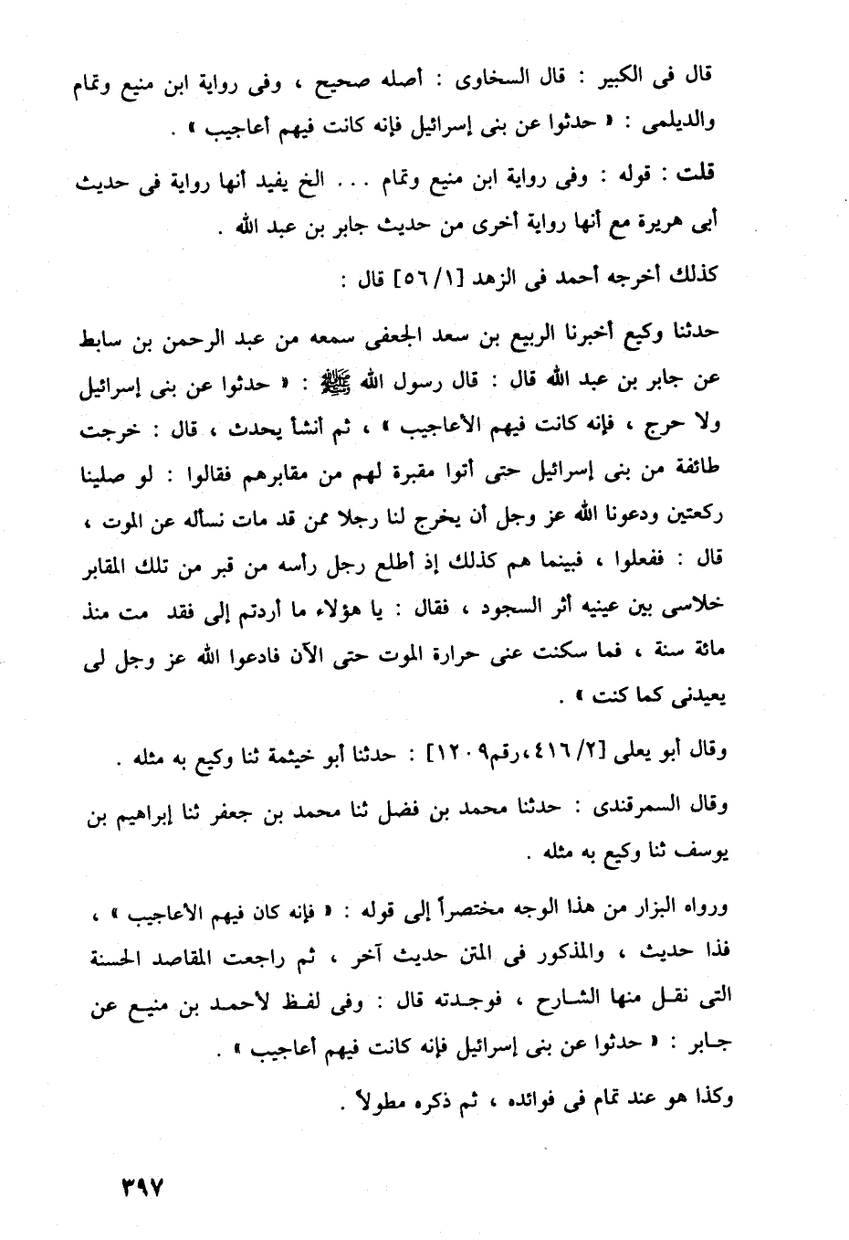 ورواه البزار من هذا الوجه مختصرًا إلى قوله: "فإنه كان فيهم الأعاجيب"، فذا حديث، والمذكور في المتن حديث آخر، ثم راجعت المقاصد الحسنة التي نقل منها الشارح، فوجدته قال: وفي لفظ لأحمد بن منيع عن جابر: "حدثوا عن بنى إسرائيل فإنه كانت فيهم أعاجيب".