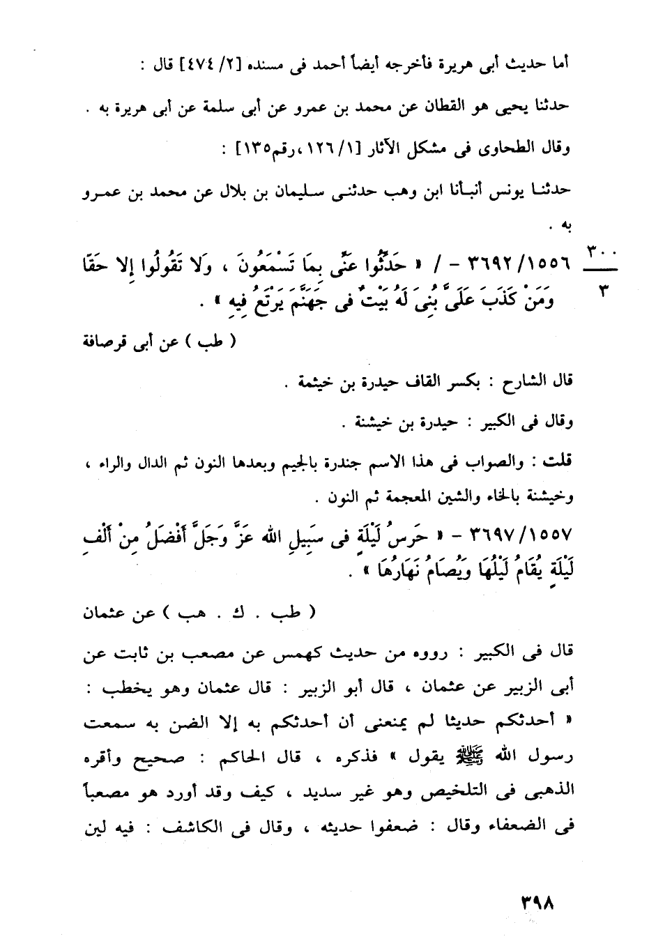 1556/ 3692 - "حَدِّثُوا عَنِّى بِمَا تَسْمَعُونَ، وَلا تَقُولُوا إِلا حَقًّا وَمَن كذَبَ عَلَيَّ بُنِيَ لَهُ بَيْتٌ فِي جَهَنَّمَ يَرْتَعُ فِيهِ".