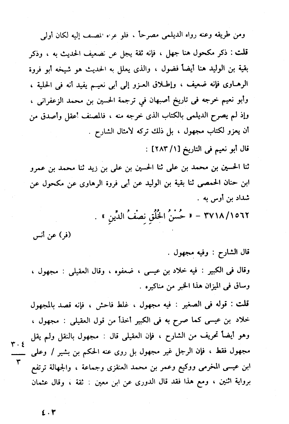 قلت: قوله في الصغير: فيه مجهول، غلط فاحش، فإنه قصد بالمجهول خلاد بن عيسى كما صرح به في الكبير أخذًا من قول العقيلى: مجهول، وهو أيضًا تحريف من الشارح، فإن العقيلى قال: مجهول بالنقل ولم يقل مجهول فقط، فإن الرجل غير مجهول بل روى عنه الحكم بن بشير وعلى ابن عيسى المخرمى ووكيع وعمر بن محمد العنقزى وجماعة، والجهالة ترتفع برواية اثنين، ومع هذا فقد قال الدورى عن ابن معين: ثقة، وقال عثمان