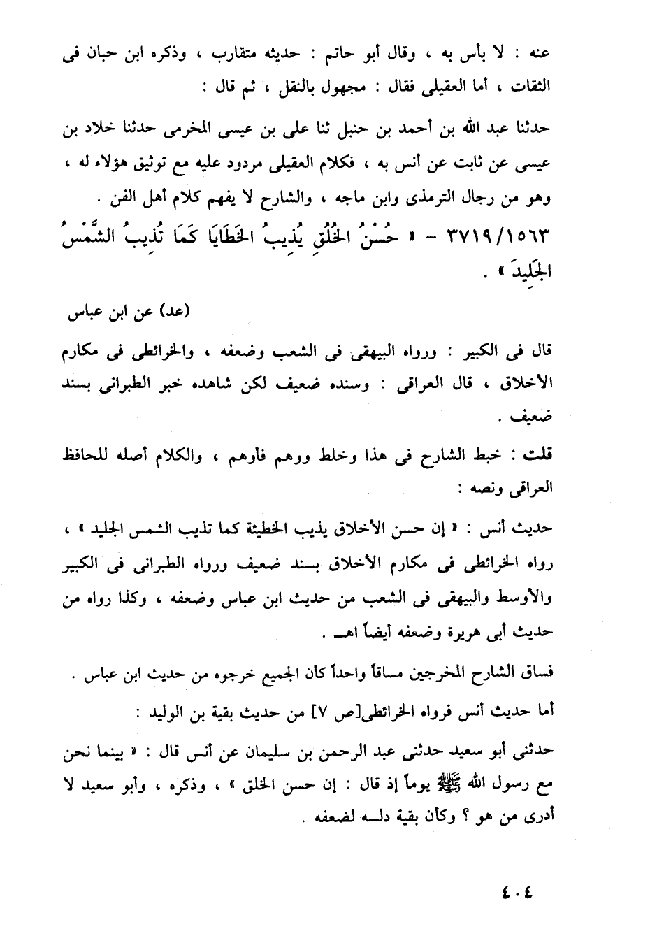 حديث أنس: "إن حسن الأخلاق يذيب الخطيئة كما تذيب الشمس الجليد"، رواه الخرائطى في مكارم الأخلاق بسند ضعيف ورواه الطبرانى في الكبير والأوسط والبيهقى في الشعب من حديث ابن عباس وضعفه، وكذا رواه من حديث أبي هريرة: وضعفه أيضًا اهـ.