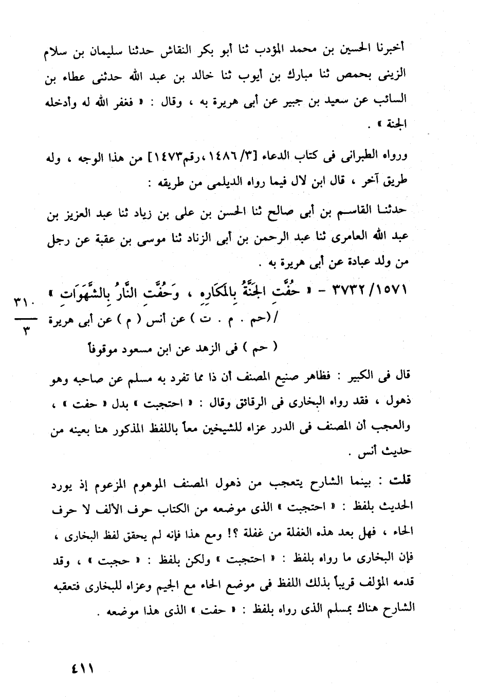قلت: بينما الشارح يتعجب من ذهول المصنف الموهوم المزعوم إذ يورد الحديث بلفظ: "احتجبت" الذي موضعه من الكتاب حرف الألف لا حرف الحاء، فهل بعد هذه الغفلة من غفلة؟! ومع هذا فإنه لم يحقق لفظ البخارى، فإن البخارى ما رواه بلفظ: "احتجبت" ولكن بلفظ: "حجبت"، وقد قدمه المؤلف قريبًا بذلك اللفظ في موضع الحاء مع الجيم وعزاه للبخارى فتعقبه الشرح هناك بمسلم الذي رواه بلفظ: "حفت" الذي هذا موضعه.