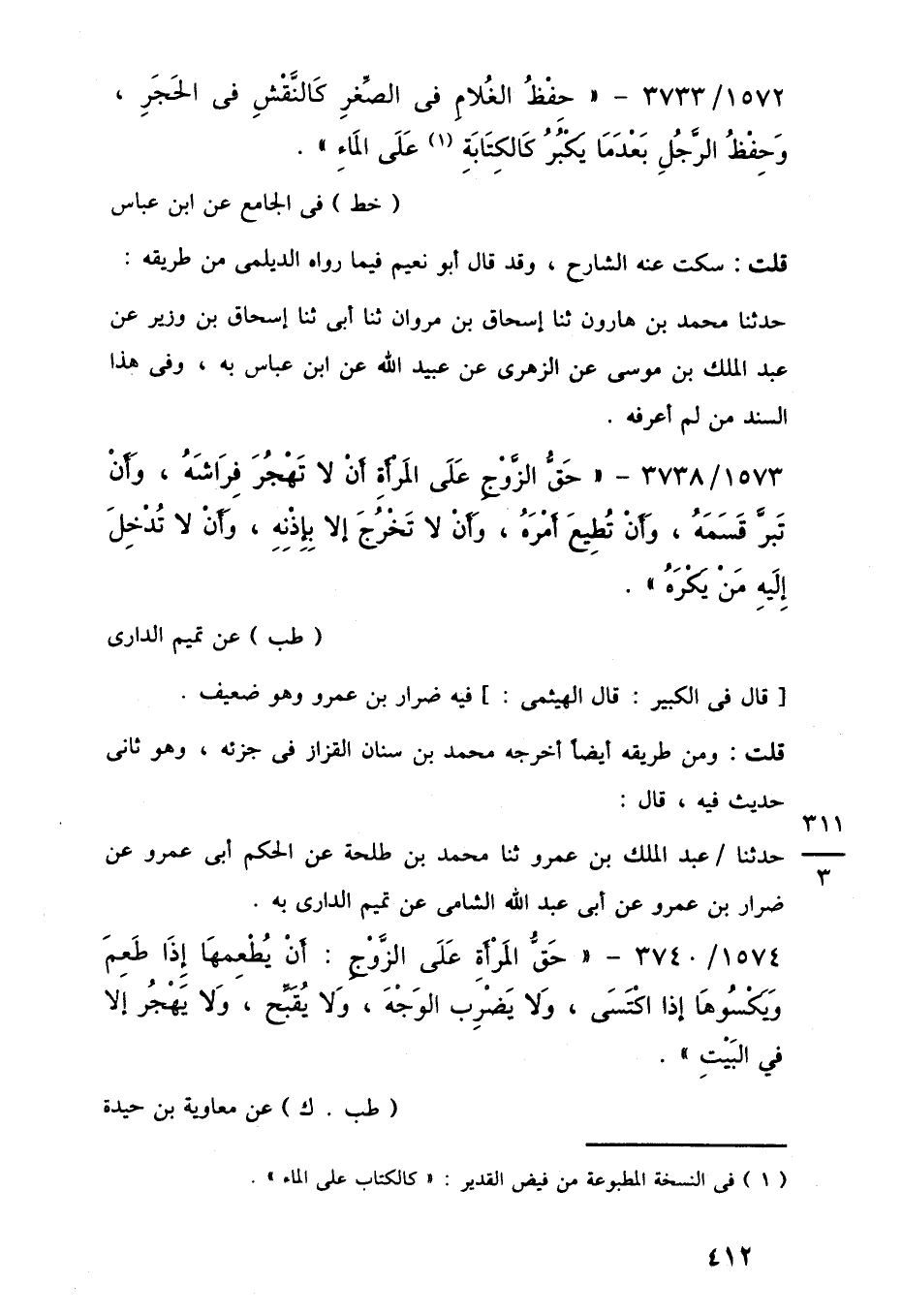 1574/ 3740 - "حَقُّ المَرْأَةِ عَلَى الزَّوْجِ: أَنْ يُطعِمهَا إِذَا طَعِمَ وَيَكْسُوهَا إِذَا اكْتَسَى، وَلا يَضْرِب الوَجْهَ، وَلا يُقَبِّح، وَلا يَهْجُر إلا فِي البَيْتِ".