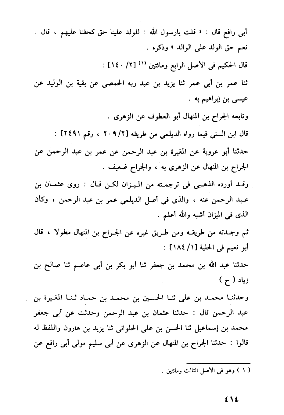 وحدثنا محمد بن على ثنا الحسين بن محمد بن حماد ثنا المغيرة بن عبد الرحمن قال: حدثنا عثمان بن عبد الرحمن وحدثت عن أبي جعفر محمد بن إسماعيل ثنا الحسن بن على الحلوانى ثنا يزيد بن هارون واللفظ له قالوا: حدثنا الجراح بن المنهال عن الزهرى عن أبي سليم مولى أبي رافع عن