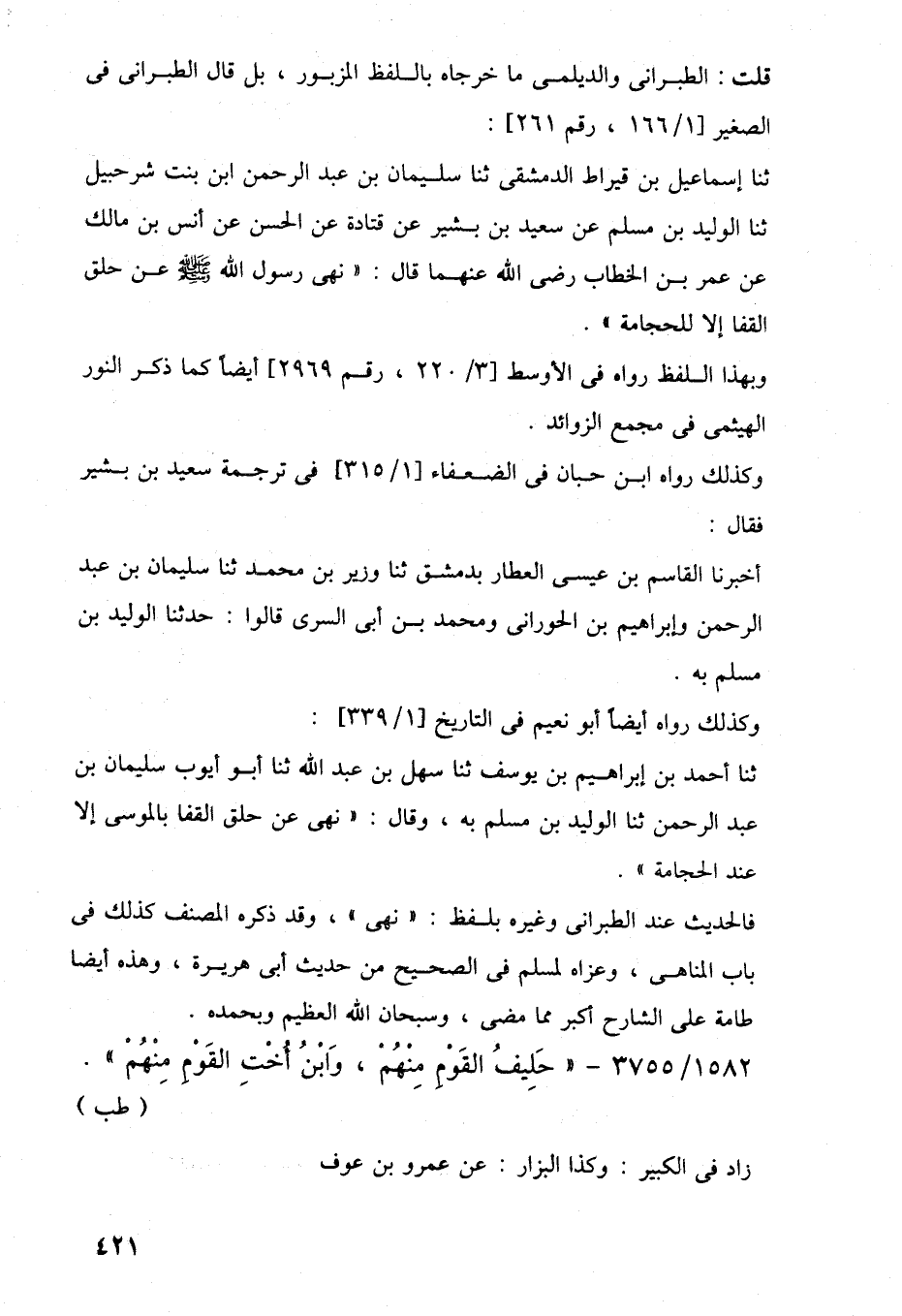 ثنا إسماعيل بن قيراط الدمشقى ثنا سليمان بن عبد الرحمن ابن بنت شرحبيل ثنا الوليد بن مسلم عن سعيد بن بشير عن قتادة عن الحسن عن أنس بن مالك عن عمر بن الخطاب رضي اللَّه عنهما قال: "نهى رسول اللَّه -صلى اللَّه عليه وسلم- عن حلق القفا إلا للحجامة".