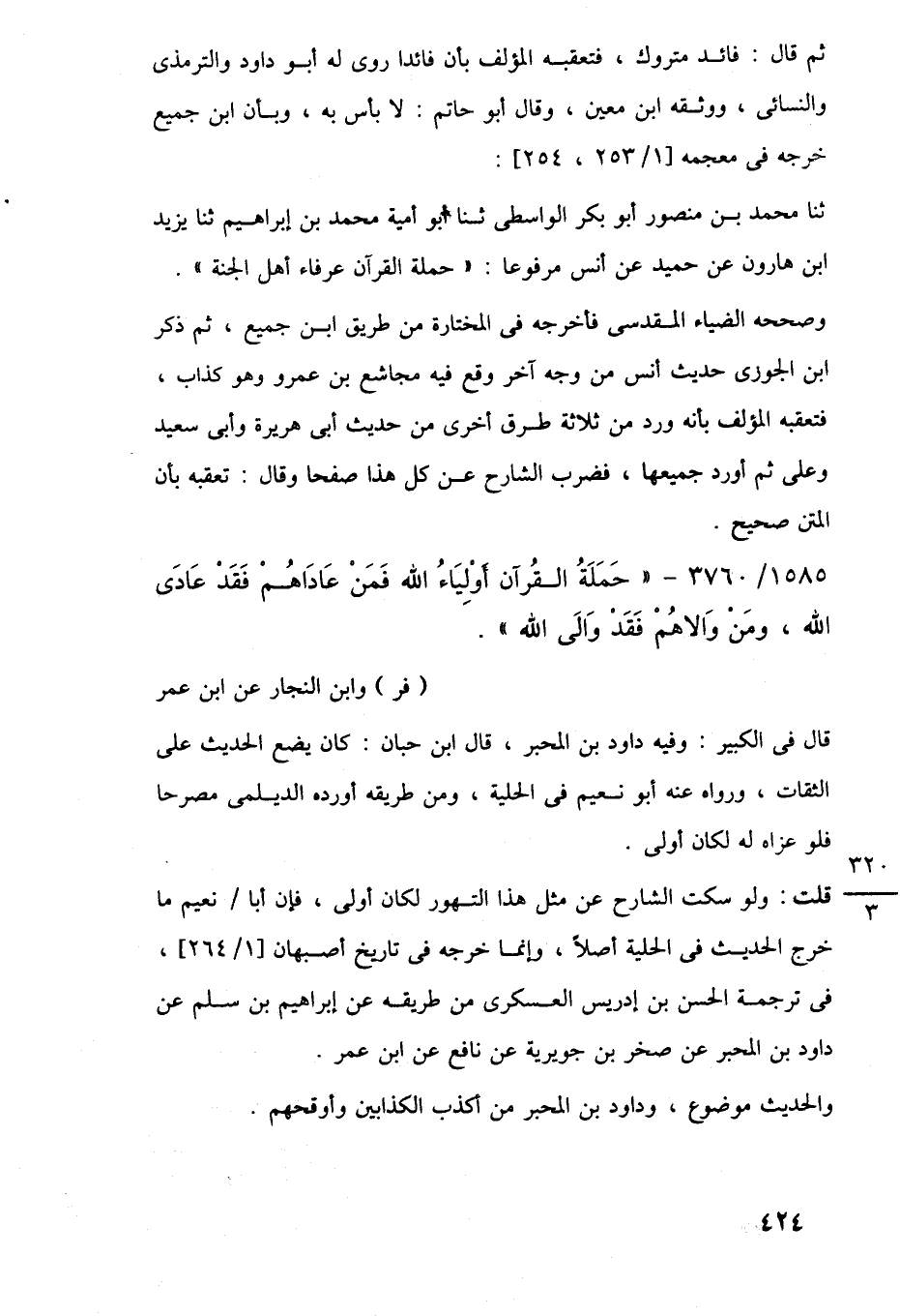 1585/ 3760 - "حَمَلَةُ القُرآن أَوْلِيَاءُ اللَّه فَمَنْ عَادَاهُمْ فَقَدْ عَادَى اللَّه، ومَنْ وَالاهُمْ فَقَدْ وَالَى اللَّه".