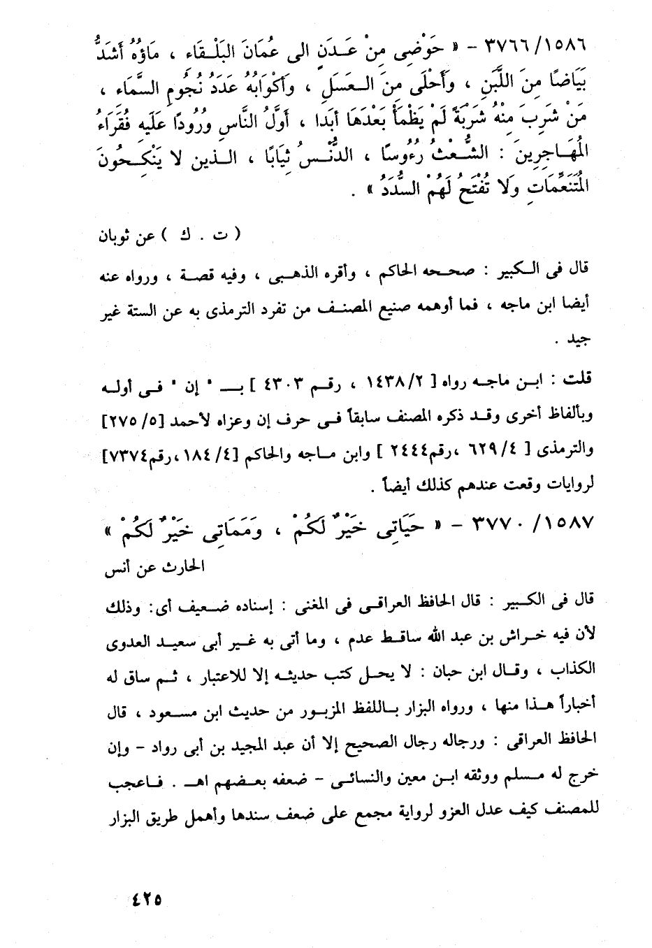 1586/ 3766 - "حَوْضِى مِنْ عَدَنٍ إلى عُمَانَ البَلْقَاءِ، مَاؤُهُ أَشَدُّ بَيَاضًا مِنَ اللَّبَنِ، وَأَحْلَى مِنَ العَسَلِ، وَأَكْوَابُهُ عَدَدُ نُجُومِ السَّمَاءِ، مَنْ شَرِبَ مِنْهُ شَرْبَةً لَمْ يَظْمَأ بَعْدَهَا أَبَدًا، أوَّلُ النَّاسِ وُرُودًا عَلَيهِ فُقَرَاءُ المُهَاجِرِينَ: الشُّعْثُ رُؤُسًا، الدُّنْسُ ثِيَابًا، الذين لا يَنْكَحُونَ المُتَنَعِّمَاتِ وَلا تُفْتَحُ لَهُمْ السُّدَدُ".