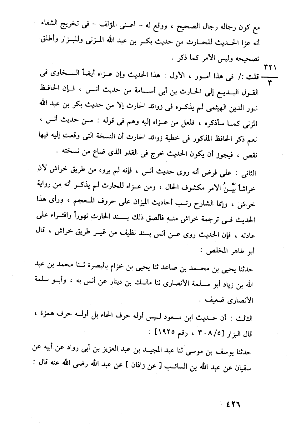 الثانى: على فرض أنه روى حديث أنس، فإنه لم يروه من طريق خراش لأن خراشًا بَيِّنُ الأمر مكشوف الحال، ومن عزاه للحارث لم يذكر أنه من رواية خراش، وإنما الشارح رتب أحاديث الميزان على حروف المعجم، ورأى هذا الحديث في ترجمة خراش منه فألصق ذلك بسند الحارث تهورًا وافتراء على عادته، فإن الحديث روى عن أنس بسند نظيف من غير طريق خراش، قال أبو طاهر المخلص:
