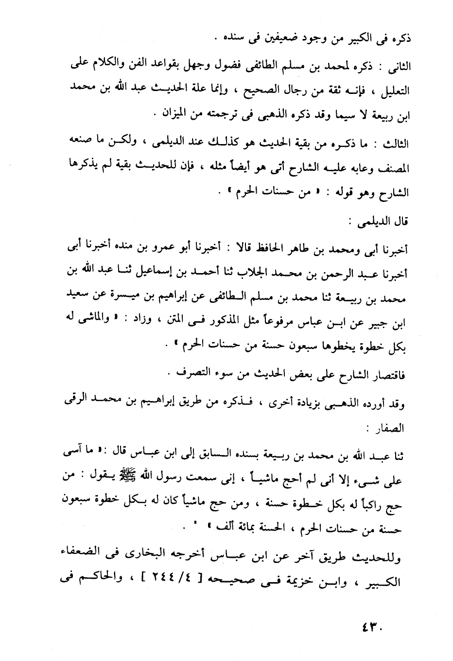 ثنا عبد اللَّه بن محمد بن ربيعة بسنده السابق إلى ابن عباس قال: "ما آسى على شيء إلا أنى لم أحج ماشيًا، إنى سمعت رسول اللَّه -صلى اللَّه عليه وسلم- يقول: من حج راكبًا له بكل خطوة حسنة، ومن حج ماشيًا كان له بكل خطوة سبعون حسنة من حسنات الحرم، الحسنة بمائة ألف".
