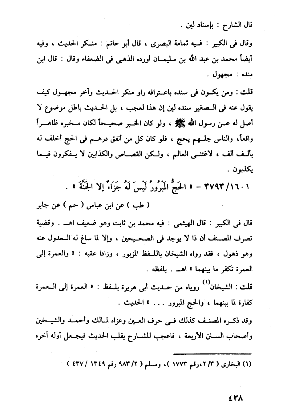 1601/ 3793 - "الحَجُّ المَبْرُورُ لَيْسَ لَهُ جَزَاءٌ إلا الجَنَّةَ".