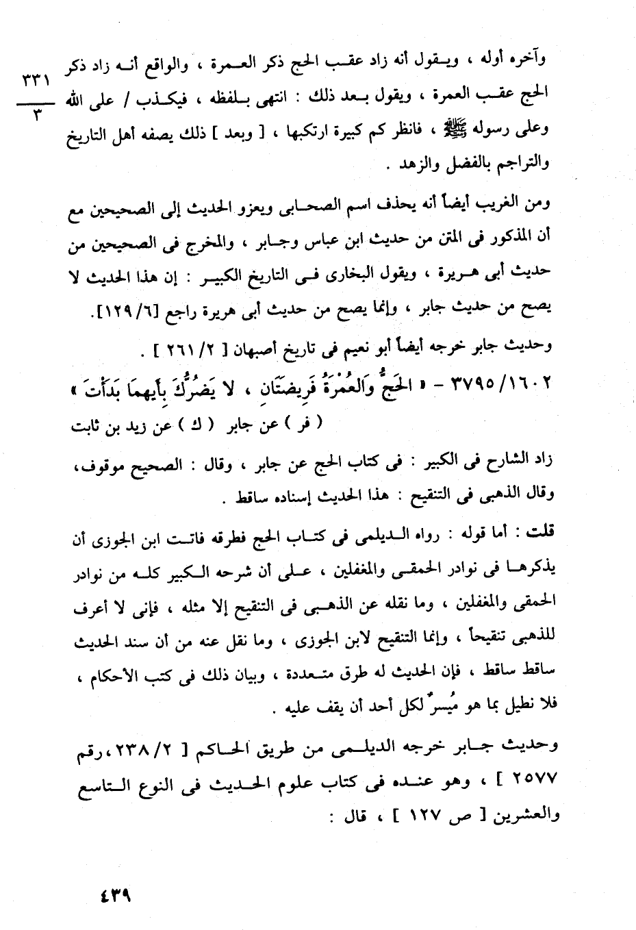 ومن الغريب أيضًا أنه يحذف اسم الصحابى ويعزو الحديث إلى الصحيحين مع أن المذكور في المتن من حديث ابن عباس وجابر، والمخرج في الصحيحين من حديث أبي هريرة، ويقول البخارى في التاريخ الكبير: إن هذا الحديث لا يصح من حديث جابر، وإنما يصح من حديث أبي هريرة راجع [6/ 129].