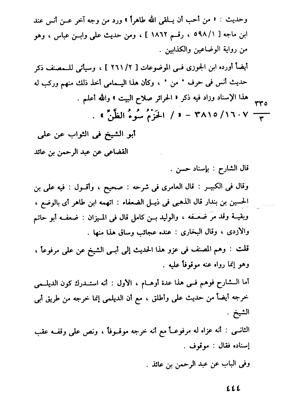 وقال في الكبير: قال العامرى في شرحه: صحيح، وأقول: فيه على بن الحسين بن بندار قال الذهبى في ذيل الضعفاء: اتهمه ابن طاهر أي بالوضع، وبقية وقد مر ضعفه، والوليد بن كامل قال في الميزان: ضعفه أبو حاتم والأزردى، وقال البخارى: عنده عجائب وساق هذا منها.