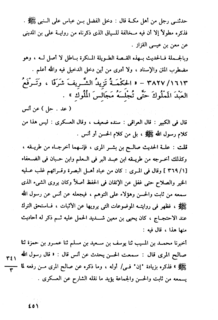 قلت: علة الحديث صالح بن بشر المرى، فإنهما أخرجاه من طريقه، وكذلك أخرجه من طريقه ابن عبد البر في العلم وابن حبان في الضعفاء [1/ 369] وقال في المرى: كان من عباد أهل البصرة وقرائهم غلب عليه الخير والصلاح حتى غفل عن الإتقان في الحفظ أصلًا وكان يروى الشيء الذي سمعه من ثابت والحسن وهؤلاء على التوهم، فيجعله عن أنس عن رسول اللَّه -صلى اللَّه عليه وسلم-، فظهر في روايته الموضوعات التي يرويها عن الأثبات، فاستحق الترك عند الاحتجاج، كان يحيى بن معين شديد الحمل عليه ثم ذكر له أحاديث منها هذا، قال فيه:
