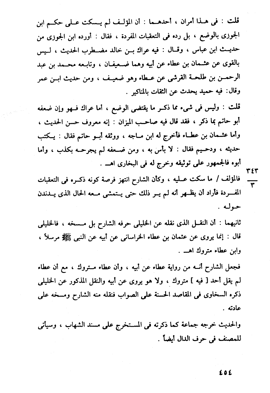 قلت: في هذا أمران، أحدهما: أن المؤلف لم يسكت على حكم ابن الجورى بالوضع، بل رده في التعقبات المفردة، فقال: أورده ابن الجوزى من حديث ابن عباس، وقال: فيه عراك بن خالد مضطرب الحديث، ليس بالقوى عن عثمان بن عطاء عن أبيه وهما ضعيفان، وتابعه محمد بن عبد الرحمن بن طلحة القرشى عن عطاء وهو ضعيف، ومن حديث ابن عمر وقال: فيه حميد يحدث عن الثقات بالمناكير.