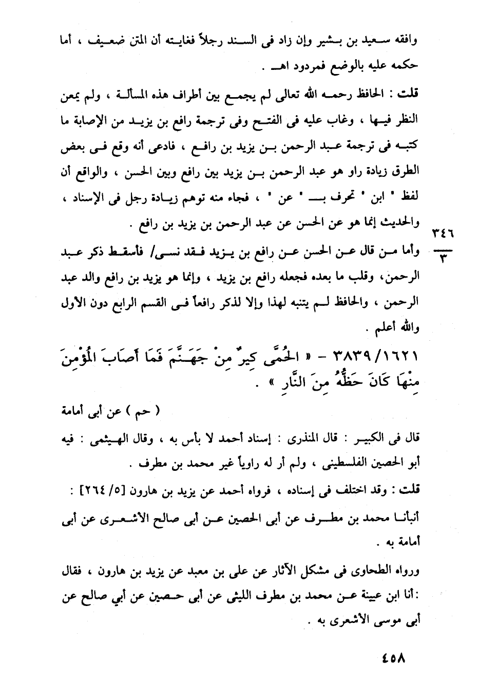 قلت: الحافظ رحمه اللَّه تعالى لم يجمع بين أطراف هذه المسألة، ولم يمعن النظر فيها، وغاب عليه في الفتح وفي ترجمة رافع بن يزيد من الإصابة ما كتبه في ترجمة عبد الرحمن بن يزيد بن رافع، فادعى أنه وقع في بعض الطرق زيادة راو هو عبد الرحمن بن بزيد بين رافع وبين الحسن، والواقع أن لفظ "ابن" تحرف بـ "عن"، فجاء منه توهم زيادة رجل في الإسناد، والحديث إنما هو عن الحسن عن عبد الرحمن بن يزيد بن رافع.