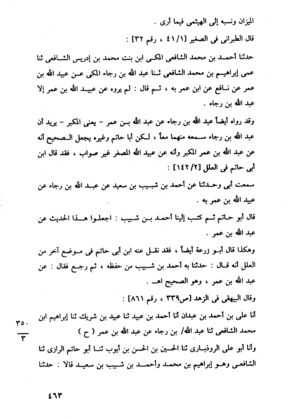 وقد رواه أيضًا عبد اللَّه بن رجاء عن عبد اللَّه بن عمر -يعنى المكبر- يريد أن عبد اللَّه بن رجاء سمعه منهما معًا، لكن أبا حاتم وغيره يجعل الصحيح أنه عن عبد اللَّه بن عمر المكبر وأنه عن عبيد اللَّه المصغر غير صواب، فقد قال ابن أبي حاتم في العلل [2/ 142]: