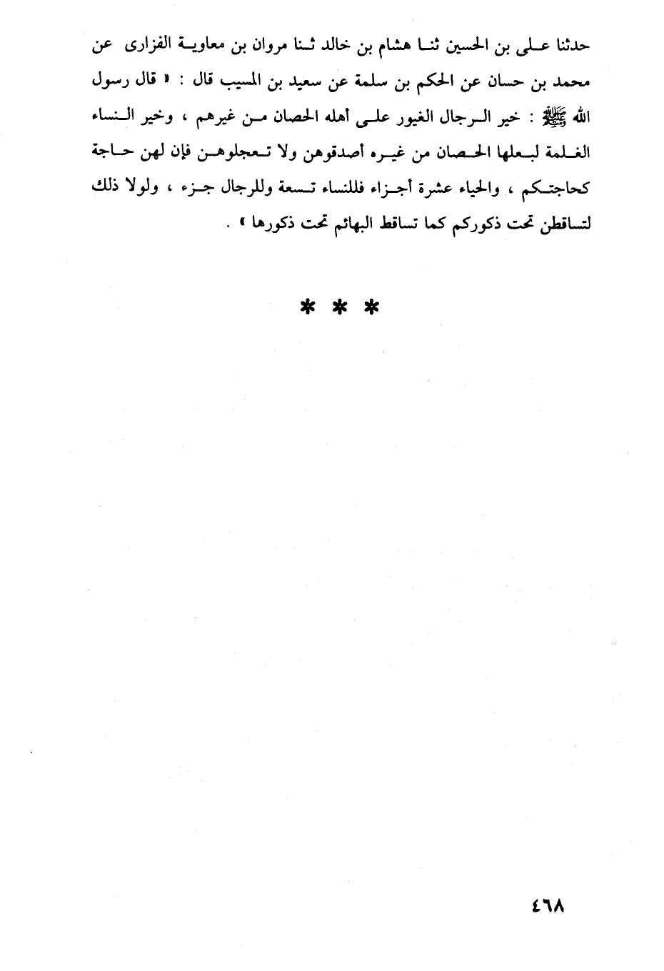 حدثنا على بن الحسين ثنا هشام بن خالد ثنا مروان بن معاوية الفزارى عن محمد بن حسان عن الحكم بن سلمة عن سعيد بن المسيب قال: "قال رسول اللَّه -صلى اللَّه عليه وسلم-: خير الرجال الغيور على أهله الحصان من غيرهم، وخير النساء الغلمة لبعلها الحصان من غيره أصدقوهن ولا تعجلوهن فإن لهن حاجة كحاجتكم، والحياء عشرة أجزاء فللنساء تسعة وللرجال جزء، ولولا ذلك لتساقطن تحت ذكوركم كما تساقط البهائم تحت ذكورها".