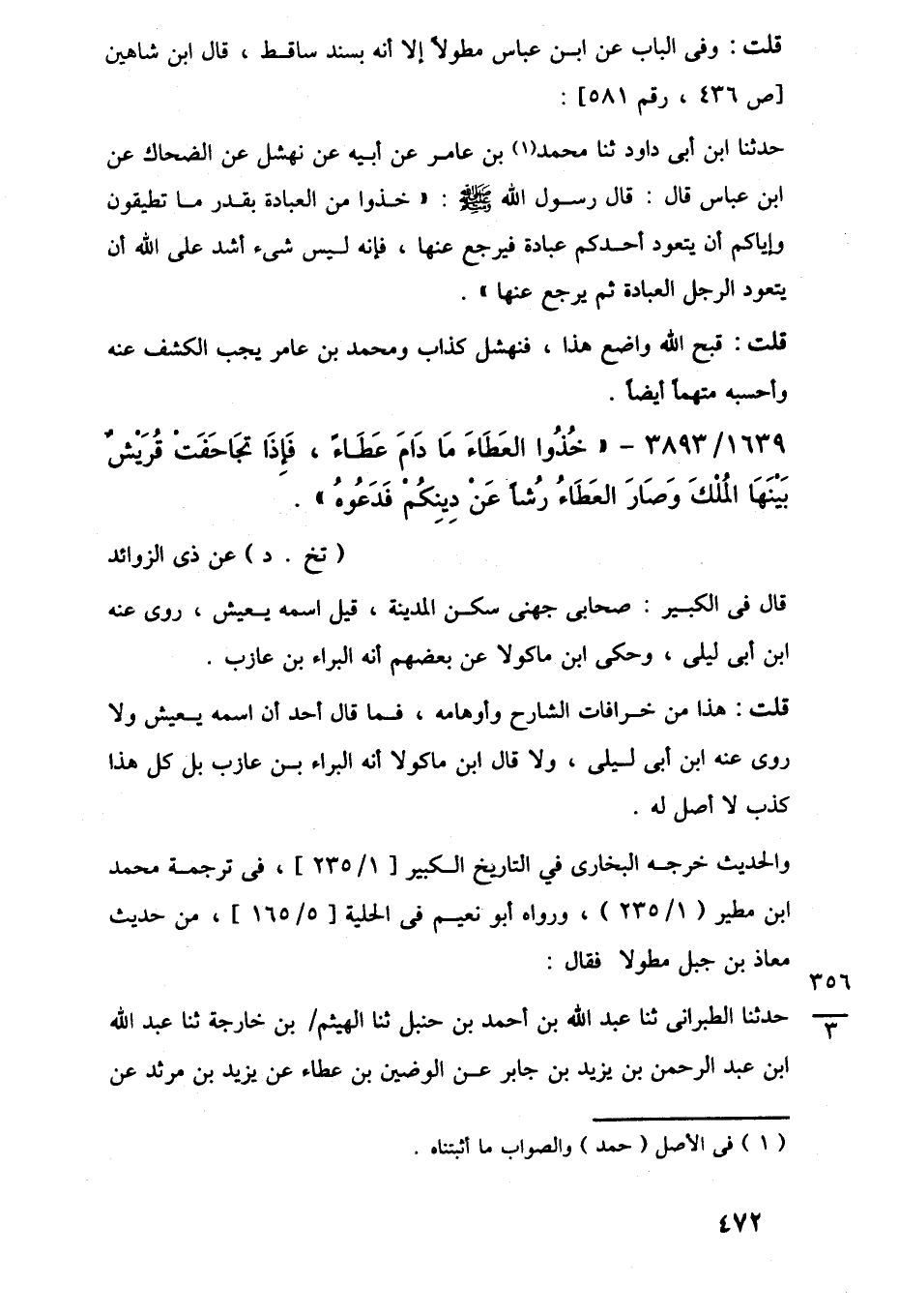 حدثنا ابن أبي داود ثنا محمد (¬1) بن عامر عن أبيه عن نهشل عن الضحاك عن ابن عباس قال: قال رسول اللَّه -صلى اللَّه عليه وسلم-: "خذوا من العبادة بقدر ما تطيقون وإياكم أن يتعود أحدكم عبادة فيرجع عنها، فإنه ليس شيء أشد على اللَّه أن يتعود الرجل العبادة ثم يرجع عنها".