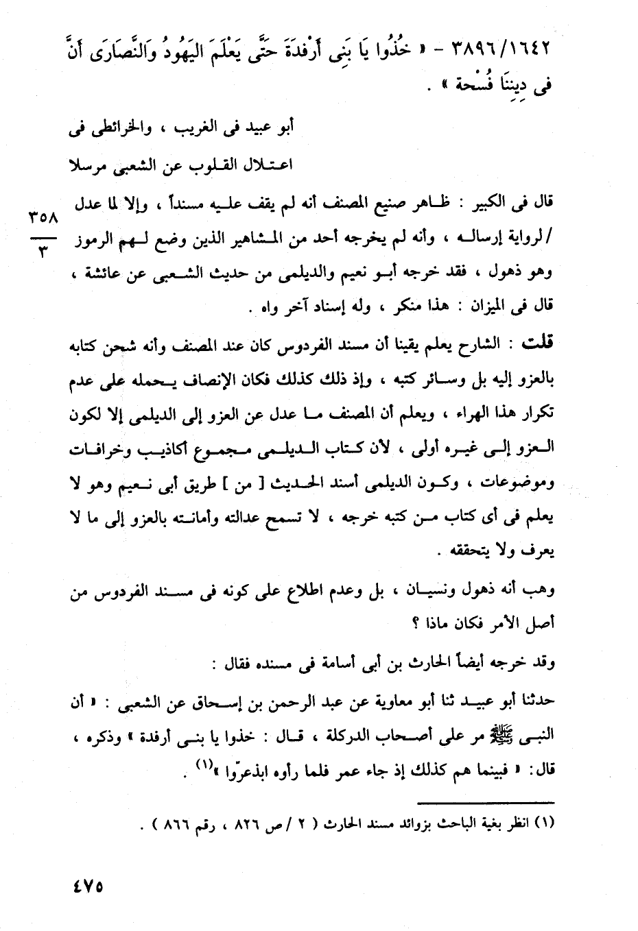 قلت: الشارح يعلم يقينا أن مسند الفردوس كان عند المصنف وأنه شحن كتابه بالعزو إليه بل وسائر كتبه، وإذ ذلك كذلك فكان الإنصاف يحمله على عدم تكرار هذا الهراء، ويعلم أن المصنف ما عدل عن العزو إلى الديلمى إلا لكون العزو إلى غيره أولى، لأن كتاب الديلمى مجموع أكاذيب وخرافات وموضوعات، وكون الديلمى أسند الحديث [من] طريق أبي نعيم وهو لا يعلم في أى كتاب من كتبه خرجه، لا تسمح عداله وأمانته بالعزو إلى ما لا يعرف ولا يتحققه.