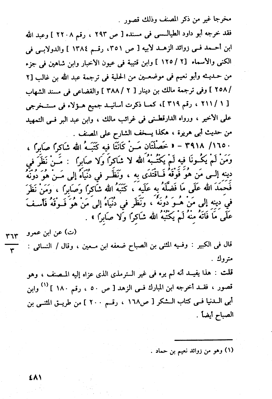 1650/ 3918 - "خَصْلَتَان مَنْ كَانَتَا فيه كَتَبَهُ اللَّه شَاكِرًا صَابرًا" وَمَنْ لَمْ يَكُونَا فِيهِ لَمْ يَكتُبْهُ اللَّه لا شَاكِرًا وَلَا صَابِرًا: مَنْ نَظَرَ في دِينِهِ إلى مَنْ هُوَ فَوْقَهُ فَاقْتَدَى بِهِ، وَنَظَر فِي دُنْيَاهُ إلَى مَنْ هُوَ دُونَهُ فَحَمَدَ اللَّه عَلَى مَا فَضَّلَهُ بهِ عَلَيهِ، كَتَبَهُ اللَّه شَاكِرًا وصَابِرًا، وَمَن نَظَرَ فِي دِينهِ إلى مَنْ هُوَ دُونَهُ، وَنَظَر فِي دُنْيَاهُ إِلَى مَنْ هُوَ فَوْقَهُ فَأَسفَ عَلَى مَا فَاتَهُ مِنْهُ لَمْ يَكْتُبْهُ اللَّه شَاكِرًا وَلا صَابِرًا".
