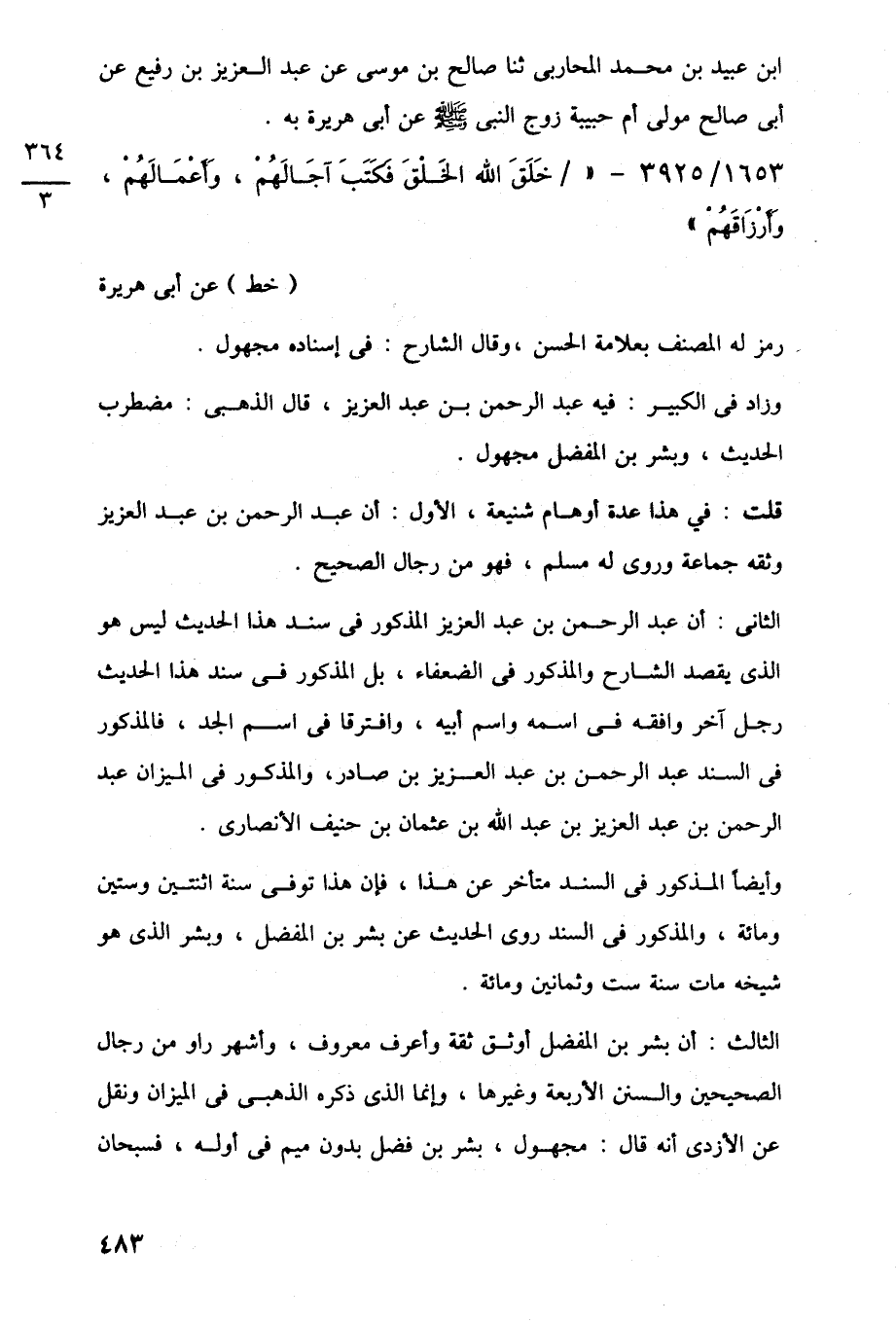 الثانى: أن عبد الرحمن بن عبد العزيز المذكور في سند هذا الحديث ليس هو الذي يقصد الشارح والمذكور في الضعفاء، بل المذكور في سند هذا الحديث رجل آخر وافقه في اسمه واسم أبيه، وافترقا في اسم الجد، فالمذكور في السند عبد الرحمن بن عبد العزيز بن صادر، والمذكور في الميزان عبد الرحمن بن عبد العزيز بن عبد اللَّه بن عثمان بن حنيف الأنصارى.