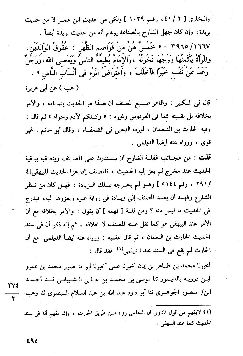 قلت: من عجائب غفلة الشارح أن يستدرك على المصنف ويتعقبه ببقية الحديث عند مخرج لم يعز اليه الحديث، فالمصنف إنما عزا الحديث للبيهقى [4/ 291، رقم 5144] وهو لم يخرجه بتلك الزيادة، فهل كان من نظر الشارح وفهمه أن يعمد المصنف إلى زيادة في رواية غيره ويعزوها إليه، فيدرج في الحديث ما ليس منه؟ ومن قلة [فهمه] أن يقول: والأمر بخلافه مع أن الأمر عند البيهقى هو كما نقل عنه المصنف لا خلافه، ثم إنه ذكر أن في سند الحديث الحارث بن النعمان، ثم قال عقبه: ورواه عنه أيضًا الديلمى مع أن الحارث لم يقع في السند عند الديلمى (¬1) فقد قال: