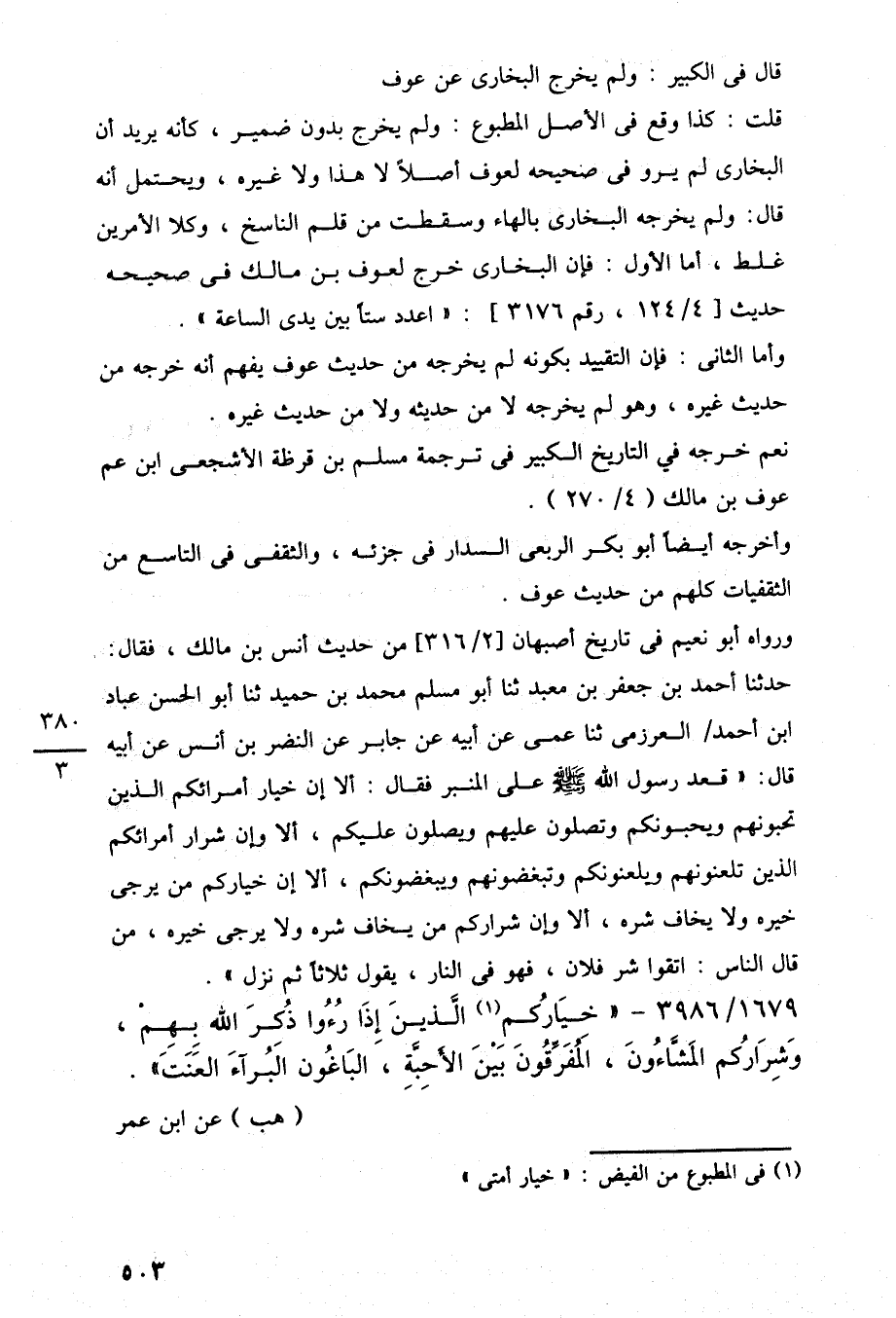 قلت: كذا وقع في الأصل المطبوع: ولم يخرج بدون ضمير، كأنه يريد أن البخارى لم يرو في صحيحه لعوف أصلًا لا هذا ولا غيره، ويحتمل أنه قال: ولم يخرجه البخارى بالهاء وسقطت من قلم الناسخ، وكلا الأمرين غلط، أما الأول: فإن البخارى خرج لعوف بن مالك في صحيحه حديث [4/ 124، رقم 3176]: "اعدد ستًا بين يدى الساعة".