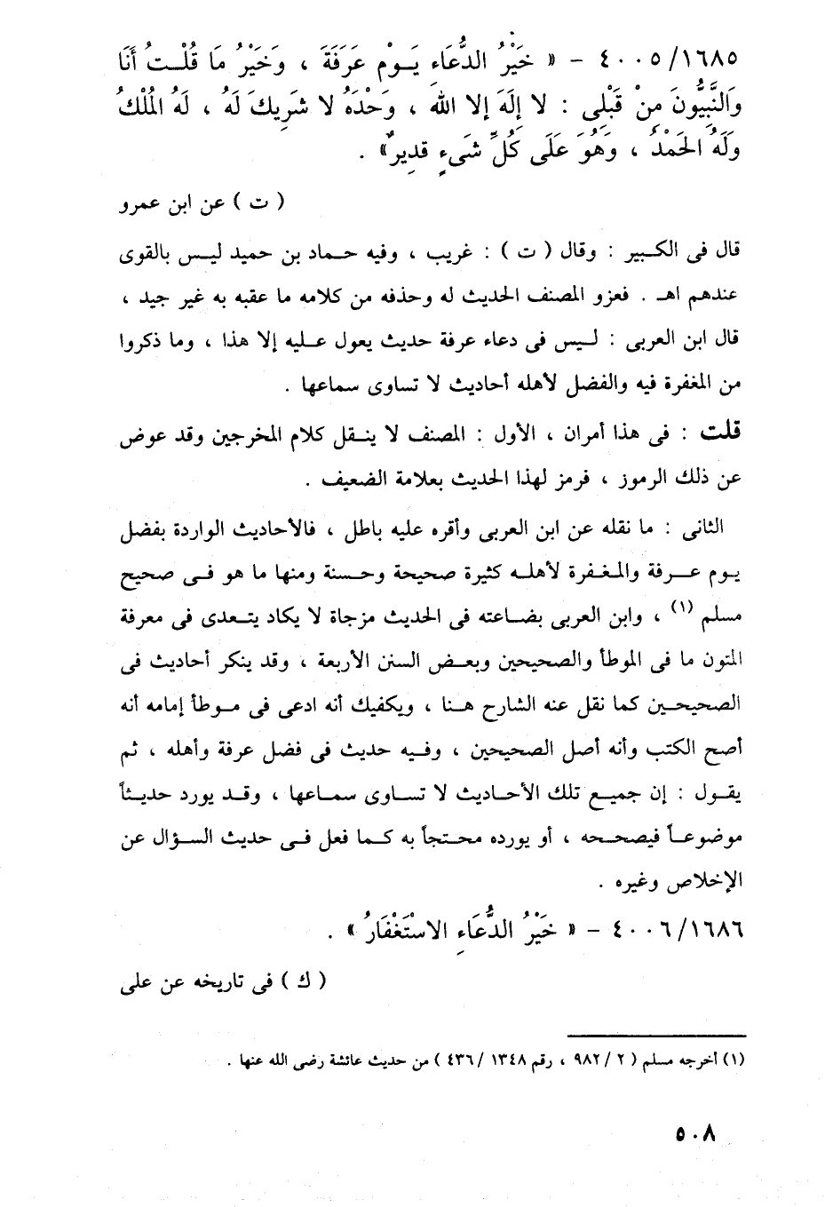 1685/ 4005 - "خَيْرُ الدُّعَاءِ يَوْمِ عَرَفَةَ، وَخَيْرُ مَا قُلْتُ أَنَا وَالنَّبِيُّونَ مِنْ قَبْلِي: لا إِلَهَ إلا اللَّهَ، وَحْدَهُ لا شَرِيكَ لَهُ، لَهُ المُلْكُ وَلَهُ الحَمْدُ، وَهُوَ عَلَى كُلِّ شَيءٍ قدِيرٌ".