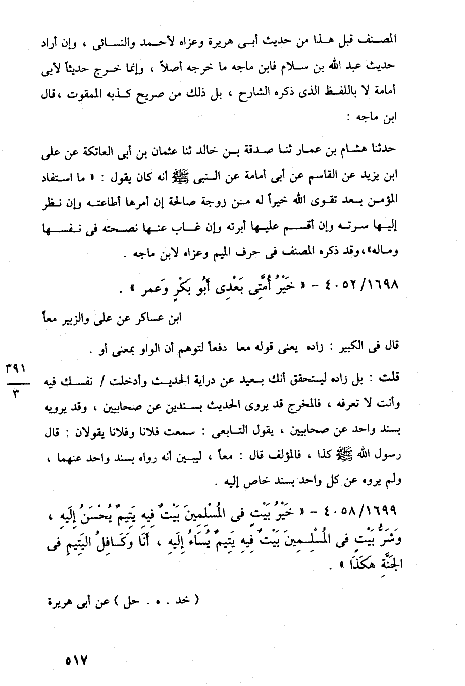 1699/ 4058 - "خَيْرُ بَيْتٍ في المُسْلِمِينَ بَيْتٌ فِيهِ يَتِيمٌ يُحْسَنُ إِلَيهِ، وَشَرُّ بَيْتٍ فِي المُسْلِمِينَ بَيْتٌ فِيهِ يَتِيمٌ يُسَاءُ إِلَيه، أَنَا وَكَافِلُ اليَتِيمِ في الجَنَّةِ هَكَذَا"