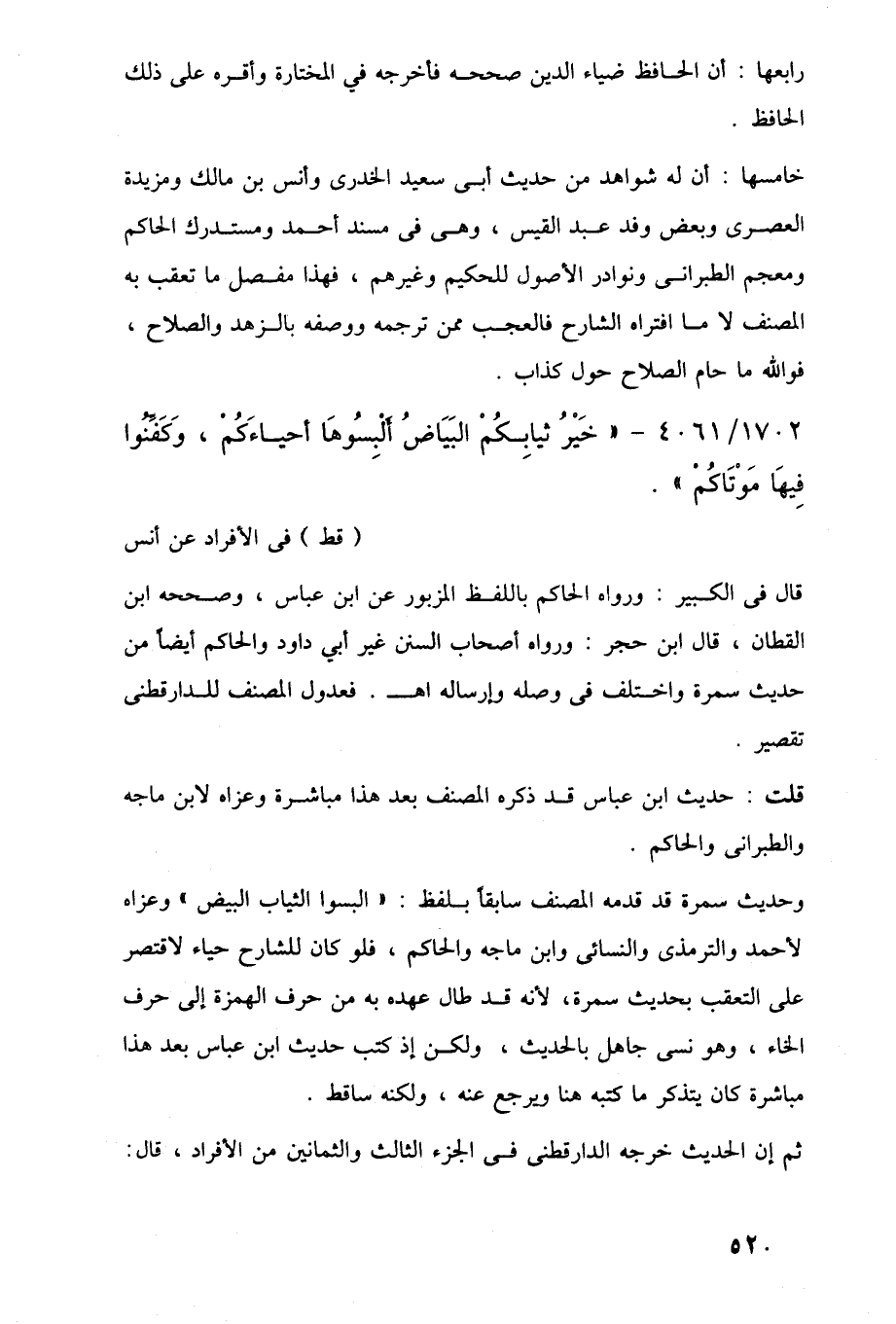وحديث سمرة قد قدمه المصنف سابقًا بلفظ: "البسوا الثياب البيض" وعزاه لأحمد والترمذى والنسائى وابن ماجه والحاكم، فلو كان للشارح حياء لاقتصر على التعقب بحديث سمرة، لأنه قد طال عهده به من حرف الهمزة إلى حرف الخاء، وهو نسى جاهل بالحديث، ولكن إذ كتب حديث ابن عباس بعد هذا مباشرة كان يتذكر ما كتبه هنا ويرجع عنه، ولكنه ساقط.