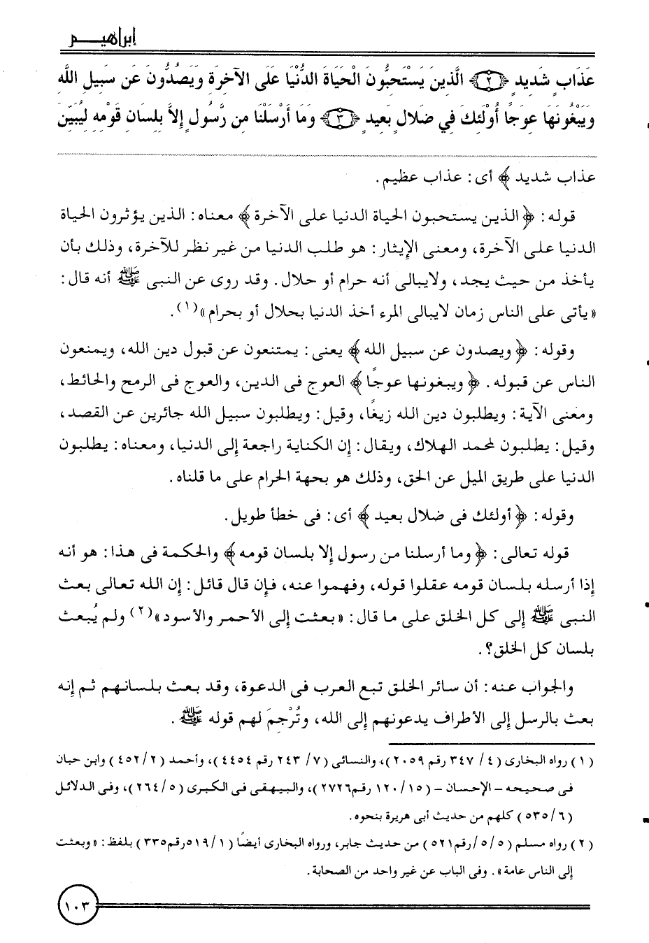 {عَذَاب شَدِيد (2) الَّذين يستحبون الْحَيَاة الدُّنْيَا على الْآخِرَة ويصدون عَن سَبِيل الله ويبغونها عوجا أُولَئِكَ فِي ضلال بعيد (3) وَمَا أرسلنَا من رَسُول إِلَّا بِلِسَان قومه ليبين} عَذَاب شَدِيد) أَي: عَذَاب عَظِيم.