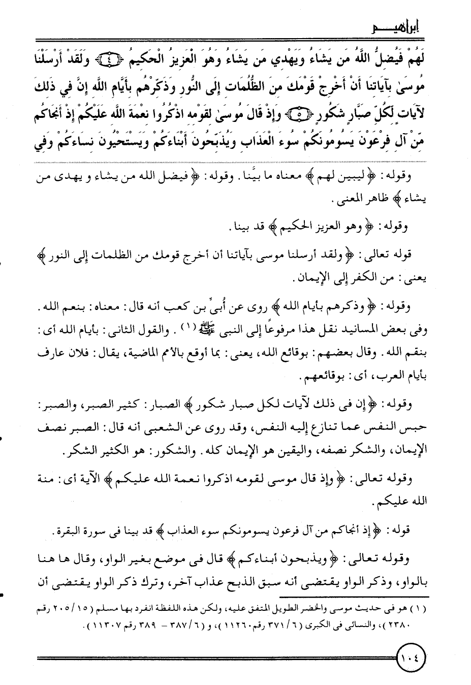 {لَهُم فيضل الله من يَشَاء وَيهْدِي من يَشَاء وَهُوَ الْعَزِيز الْحَكِيم (4) لقد أرسلنَا مُوسَى بِآيَاتِنَا أَن أخرج قَوْمك من الظُّلُمَات إِلَى النُّور وَذكرهمْ بأيام الله إِن فِي ذَلِك لآيَات لكل صبار شكور (5) وَإِذ قَالَ مُوسَى لِقَوْمِهِ اذْكروا نعْمَة الله عَلَيْكُم إِذْ أنجاكم من آل فِرْعَوْن يسومونكم سوء الْعَذَاب ويذبحون أبناءكم ويستحيون نساءكم وَفِي}