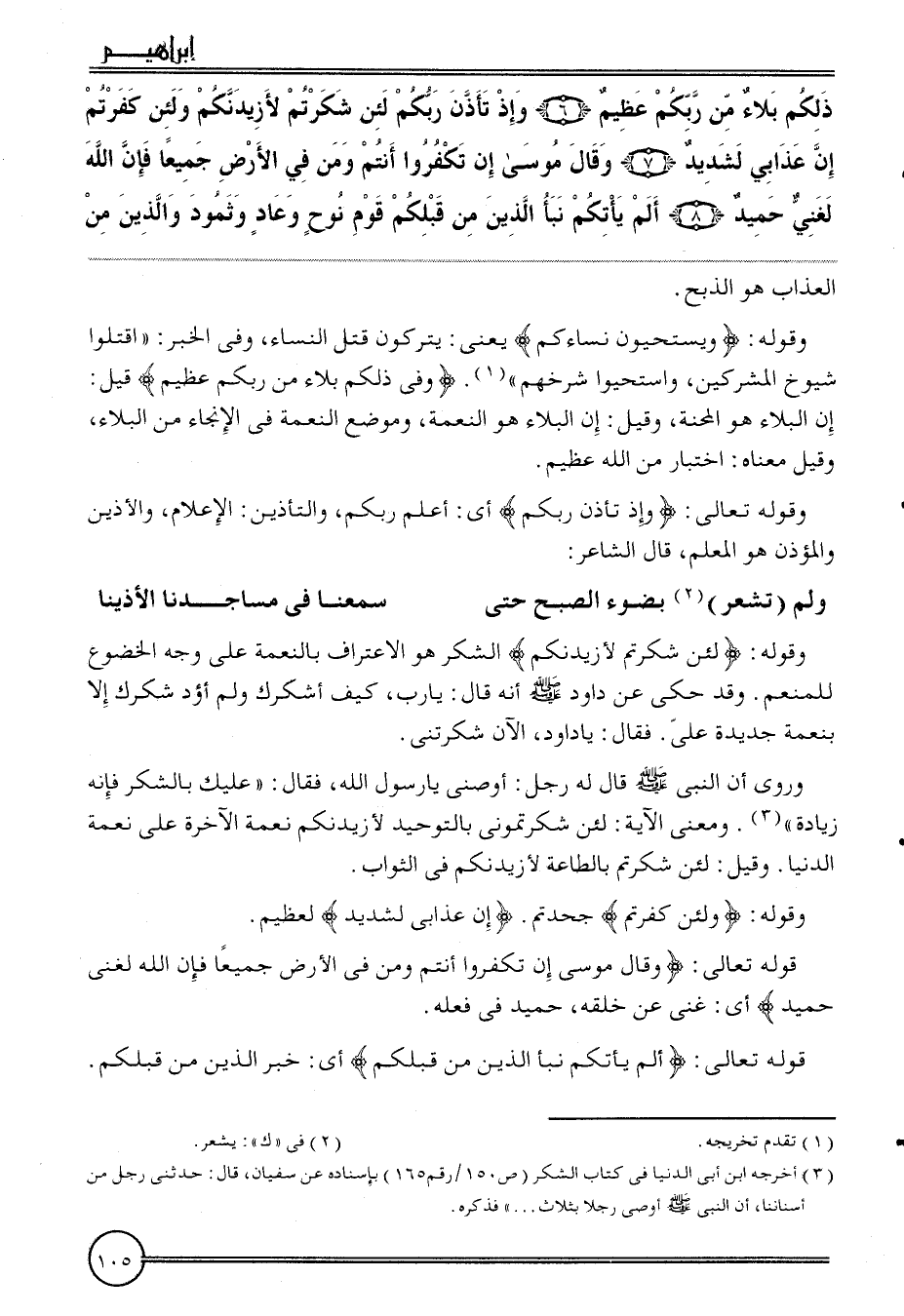 {ذَلِكُم بلَاء من ربكُم عَظِيم (6) وَإِذ تَأذن ربكُم لَئِن شكرتم لأزيدنكم وَلَئِن كَفرْتُمْ إِن عَذَابي لشديد (7) وَقَالَ مُوسَى إِن تكفرُوا أَنْتُم وَمن فِي الأَرْض جَمِيعًا فَإِن الله لَغَنِيّ حميد (8) ألم يأتكم نبأ الَّذين من قبلكُمْ قوم نوح وَعَاد وَثَمُود وَالَّذين من} الْعَذَاب هُوَ الذّبْح.