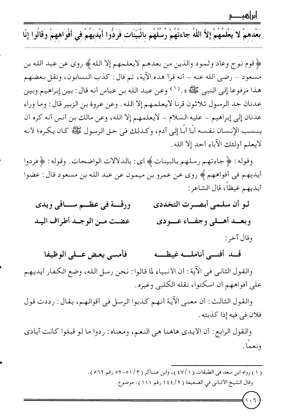 ( {بعدهمْ لَا يعلمهُمْ إِلَّا الله جَاءَتْهُم رسلهم بِالْبَيِّنَاتِ فَردُّوا أَيْديهم فِي أَفْوَاههم وَقَالُوا إِنَّا} قوم نوح وَعَاد وَثَمُود وَالَّذين من بعدهمْ لَا يعلمهُمْ إِلَّا الله) رُوِيَ عَن عبد الله بن مَسْعُود - رَضِي الله عَنهُ - أَنه قَرَأَ هَذِه الْآيَة، ثمَّ قَالَ: كذب النسابون، وَنقل بَعضهم هَذَا مَرْفُوعا إِلَى النَّبِي ". وَعَن عبد الله بن عَبَّاس أَنه قَالَ: بَين إِبْرَاهِيم وَبَين عدنان جد الرَّسُول ثَلَاثُونَ قرنا لَا يعلمهُمْ إِلَّا الله. وَعَن عُرْوَة بن الزبير قَالَ: وَمَا وَرَاء عدنان إِلَى إِبْرَاهِيم - عَلَيْهِ السَّلَام - لَا يعلمهُمْ إِلَّا الله، وَعَن مَالك بن أنس أَنه كره أَن ينْسب الْإِنْسَان نَفسه أَبَا أَبَا إِلَى آدم، وَكَذَلِكَ فِي حق الرَّسُول كَانَ يكره؛ لِأَنَّهُ لَا يعلم أُولَئِكَ الْآبَاء أحد إِلَّا الله.