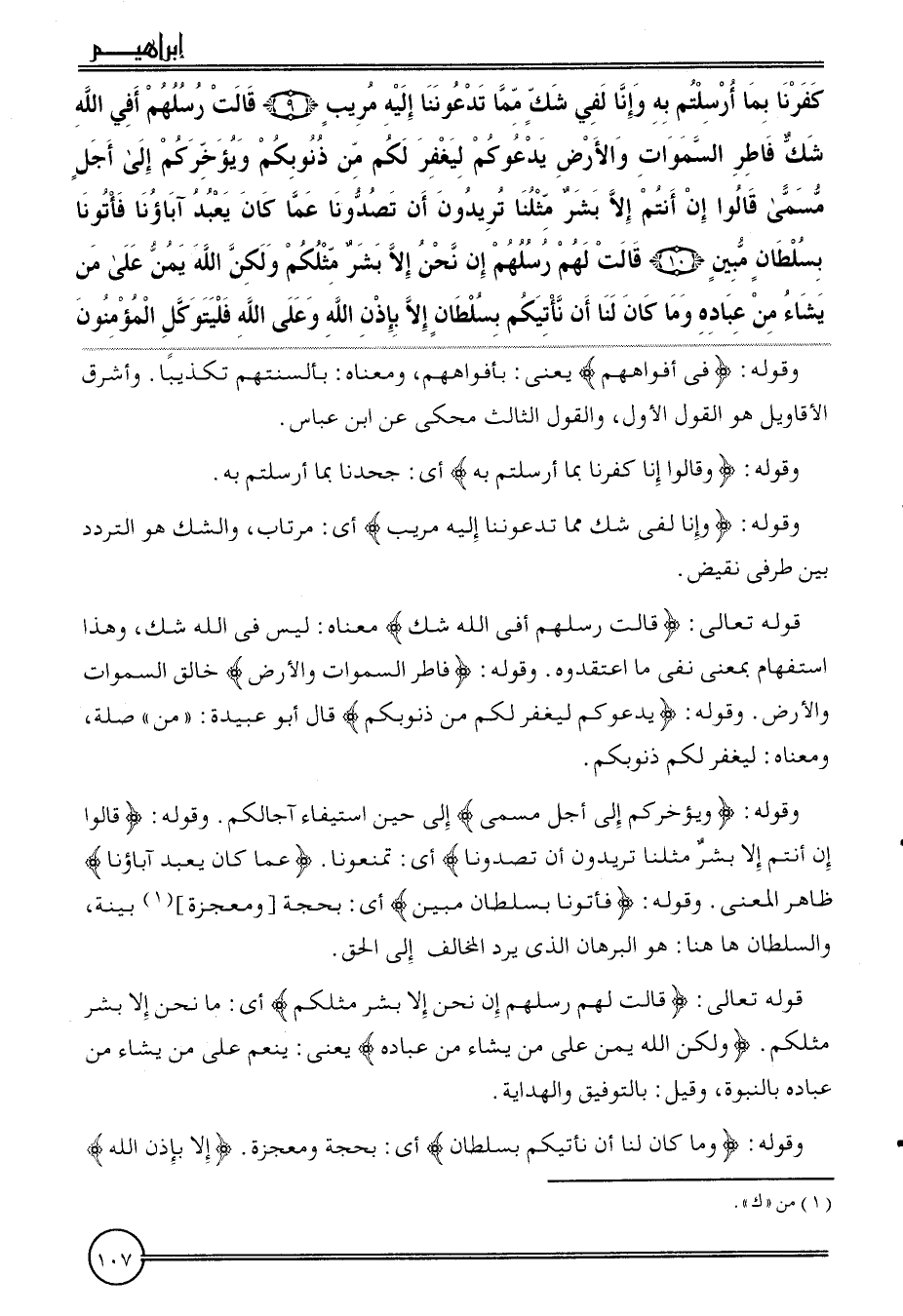 وَقَوله: {ويؤخركم إِلَى أجل مُسَمّى} إِلَى حِين اسْتِيفَاء آجالكم. وَقَوله: {قَالُوا إِن أَنْتُم إِلَّا بشر مثلنَا تُرِيدُونَ أَن تصدونا} أَي: تمنعونا. {عَمَّا كَانَ يعبد آبَاؤُنَا} ظَاهر الْمَعْنى. وَقَوله: {فأتونا بسُلْطَان مُبين} أَي: بِحجَّة [ومعجزة] بَيِّنَة، وَالسُّلْطَان هَاهُنَا: هُوَ الْبُرْهَان الَّذِي يرد الْمُخَالف إِلَى الْحق.