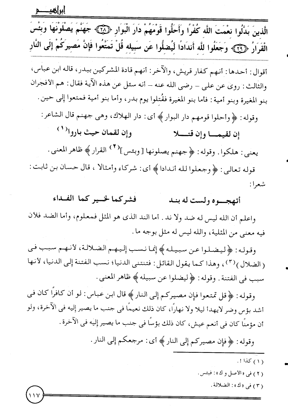 {الَّذين بدلُوا نعمت الله كفرا وَأَحلُّوا قَومهمْ دَار الْبَوَار (28) جَهَنَّم يصلونها وَبئسَ الْقَرار (29) وَجعلُوا لله أندادا ليضلوا عَن سَبيله قل تمَتَّعُوا فَإِن مصيركم إِلَى النَّار} أَقْوَال: أَحدهَا: أَنهم كفار قُرَيْش، وَالْآخر: أَنهم قادة الْمُشْركين ببدر، قَالَه ابْن عَبَّاس، وَالثَّالِث: رُوِيَ عَن عَليّ - رَضِي الله عَنهُ - أَنه سُئِلَ عَن هَذِه الْآيَة فَقَالَ: هم الأفجران بَنو الْمُغيرَة وَبَنُو أُميَّة: فَأَما بَنو الْمُغيرَة فَقتلُوا يَوْم بدر، وَأما بَنو أُميَّة فمتعوا إِلَى حِين.