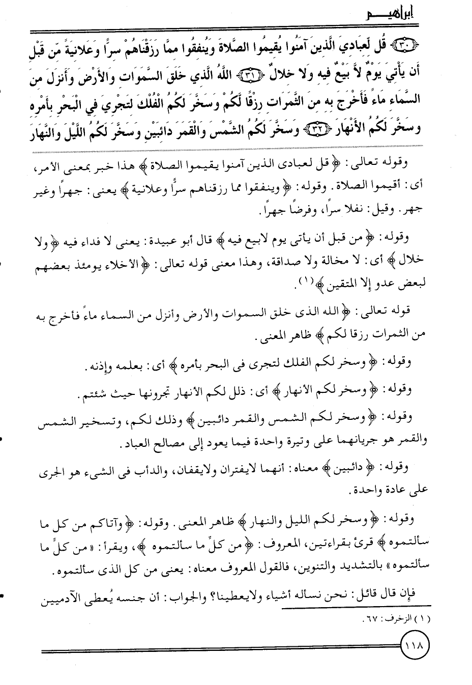 ( {30) قل لعبادي الَّذين آمنُوا يقيموا الصَّلَاة وينفقوا مِمَّا رَزَقْنَاهُمْ سرا وَعَلَانِيَة من قبل أَن يَأْتِي يَوْم لَا بيع فِيهِ وَلَا خلال (31) الله الَّذِي خلق السَّمَوَات وَالْأَرْض وَأنزل من السَّمَاء مَاء فَأخْرج بِهِ من الثمرات رزقا لكم وسخر لكم الْفلك لتجري فِي الْبَحْر بأَمْره وسخر لكم الْأَنْهَار (32) وسخر لكم الشَّمْس وَالْقَمَر دائبين وسخر لكم اللَّيْل وَالنَّهَار}