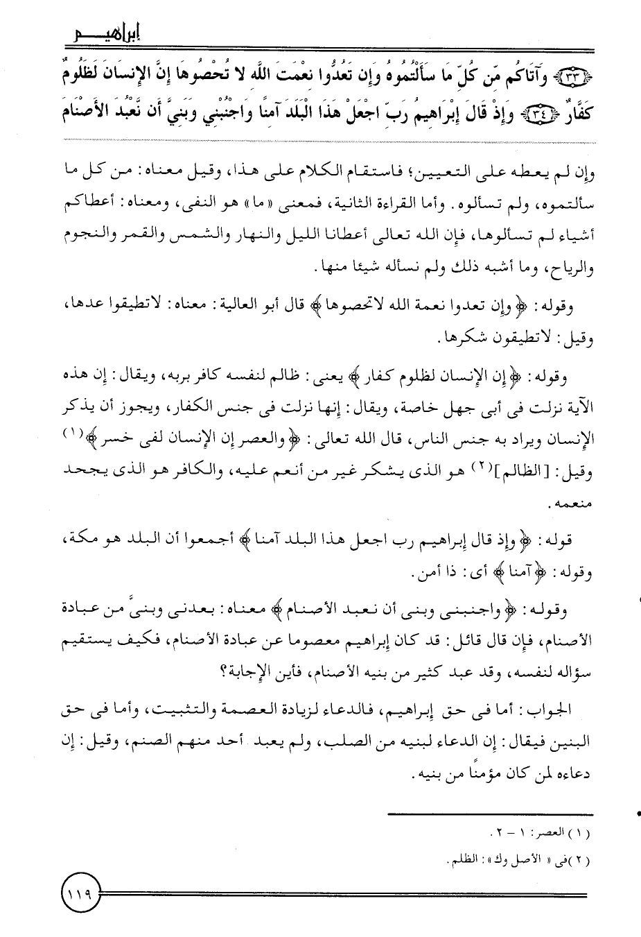 ( {33) وآتاكم من كل مَا سألتموه وَإِن تعدوا نعمت الله لَا تحصوها إِن الْإِنْسَان لظلوم كفار (34) وَإِذ قَالَ إِبْرَاهِيم رب اجْعَل هَذَا الْبَلَد آمنا واجنبني وَبني أَن نعْبد الْأَصْنَام} وَإِن لم يُعْطه على التَّعْيِين؛ فاستقام الْكَلَام على هَذَا، وَقيل مَعْنَاهُ: من كل مَا سألتموه، وَلم تسألوه. وَأما الْقِرَاءَة الثَّانِيَة، فَمَعْنَى " مَا " هُوَ النَّفْي، وَمَعْنَاهُ: أَعْطَاكُم أَشْيَاء لم تسألوها، فَإِن الله تَعَالَى أَعْطَانَا اللَّيْل وَالنَّهَار وَالشَّمْس وَالْقَمَر والنجوم والرياح، وَمَا أشبه ذَلِك وَلم نَسْأَلهُ شَيْئا مِنْهَا.