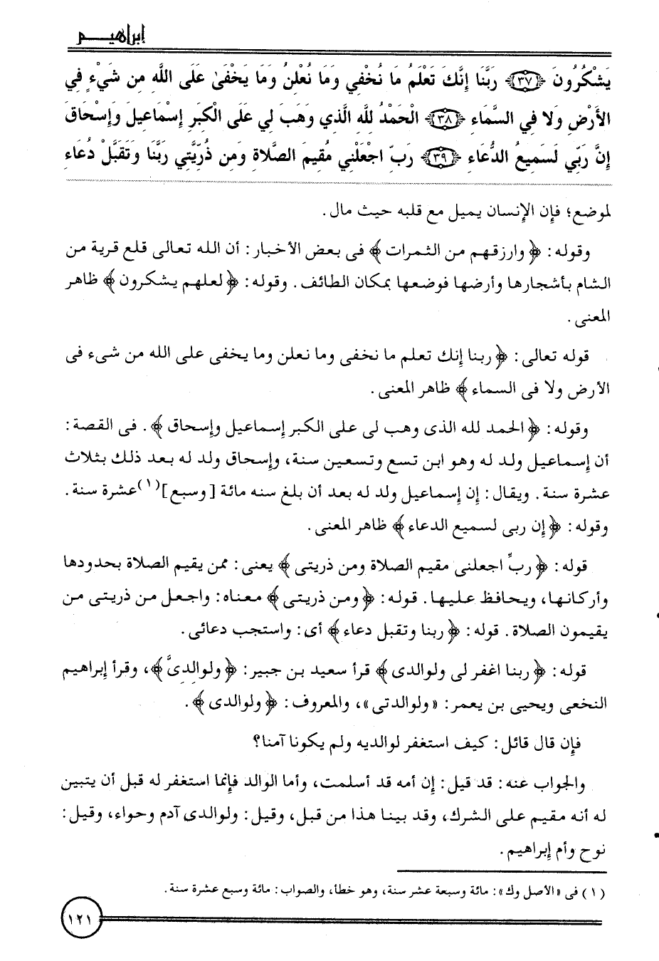 {يشكرون (37) رَبنَا إِنَّك تعلم مَا نخفي وَمَا نعلن وَمَا يخفى على الله من شَيْء فِي الأَرْض وَلَا فِي السَّمَاء (38) الْحَمد لله الَّذِي وهب لي على الْكبر إِسْمَاعِيل وَإِسْحَاق إِن رَبِّي لسميع الدُّعَاء (39) رب اجْعَلنِي مُقيم الصَّلَاة وَمن ذريتي رَبنَا وَتقبل دُعَاء} لموْضِع؛ فَإِن الْإِنْسَان يمِيل مَعَ قلبه حَيْثُ مَال.